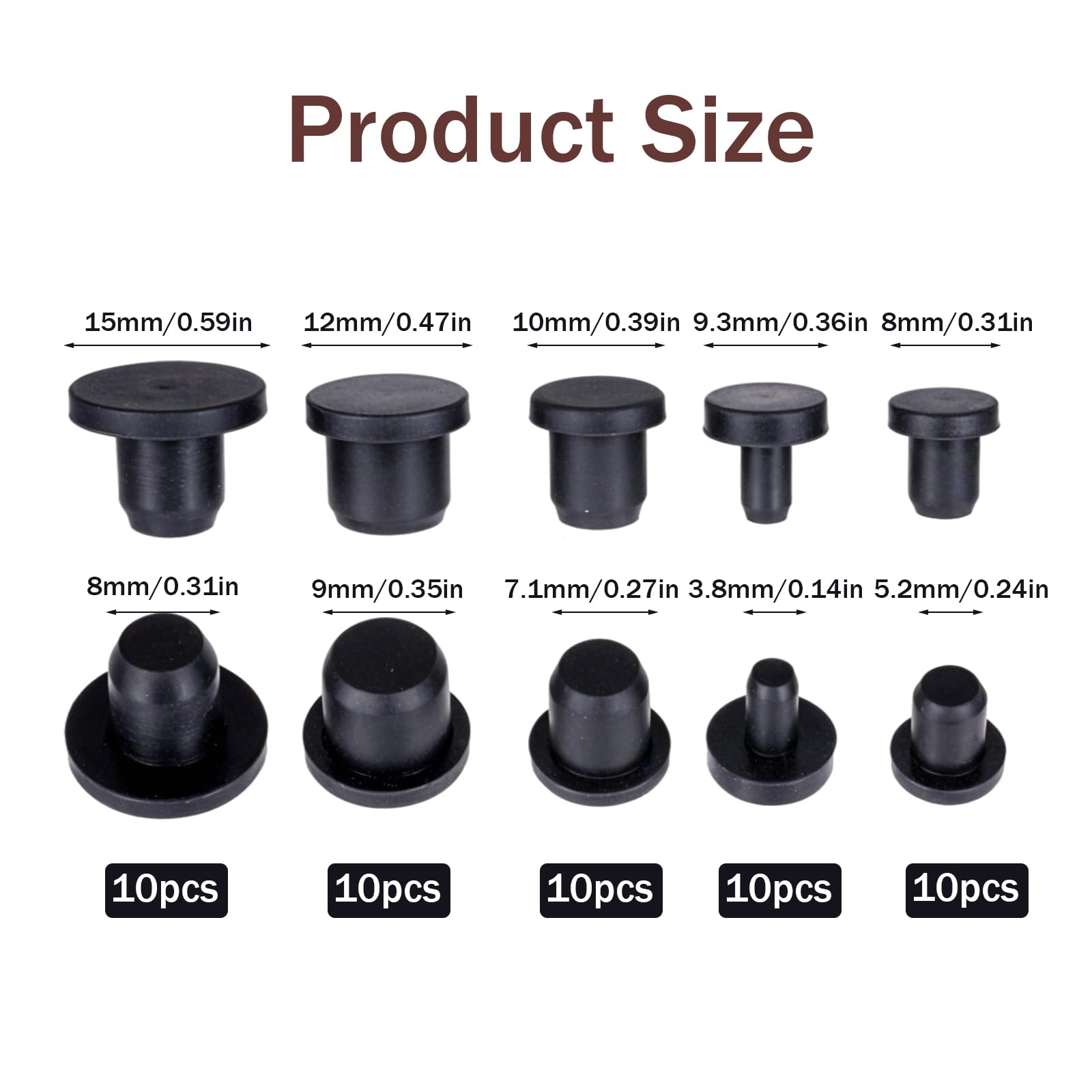 - 5 Sizes for Perfect Fit: Available in 5 sizes with head diameters ranging 15x8mm,12x9mm,10x7.1mm,8x5.2mm,9.3x3.8mm, these rubber plug fit snugly in various holes, offering reliable sealing and complete closure to prevent dust, moisture, and dirt from entering.