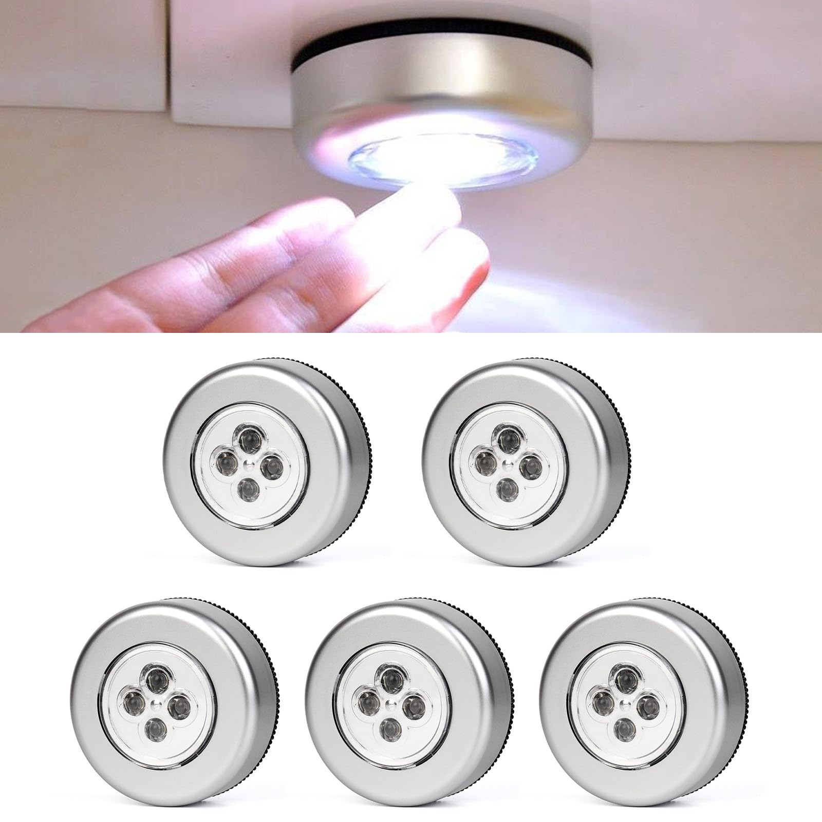 5Packs 4 Beads Tap Push Light, Under Cabinet Lights Touch Button Puck Stick On for Closet Counter Kitchen Cabinet RV(Blister Packs)