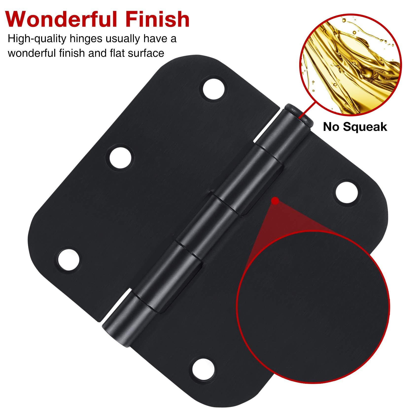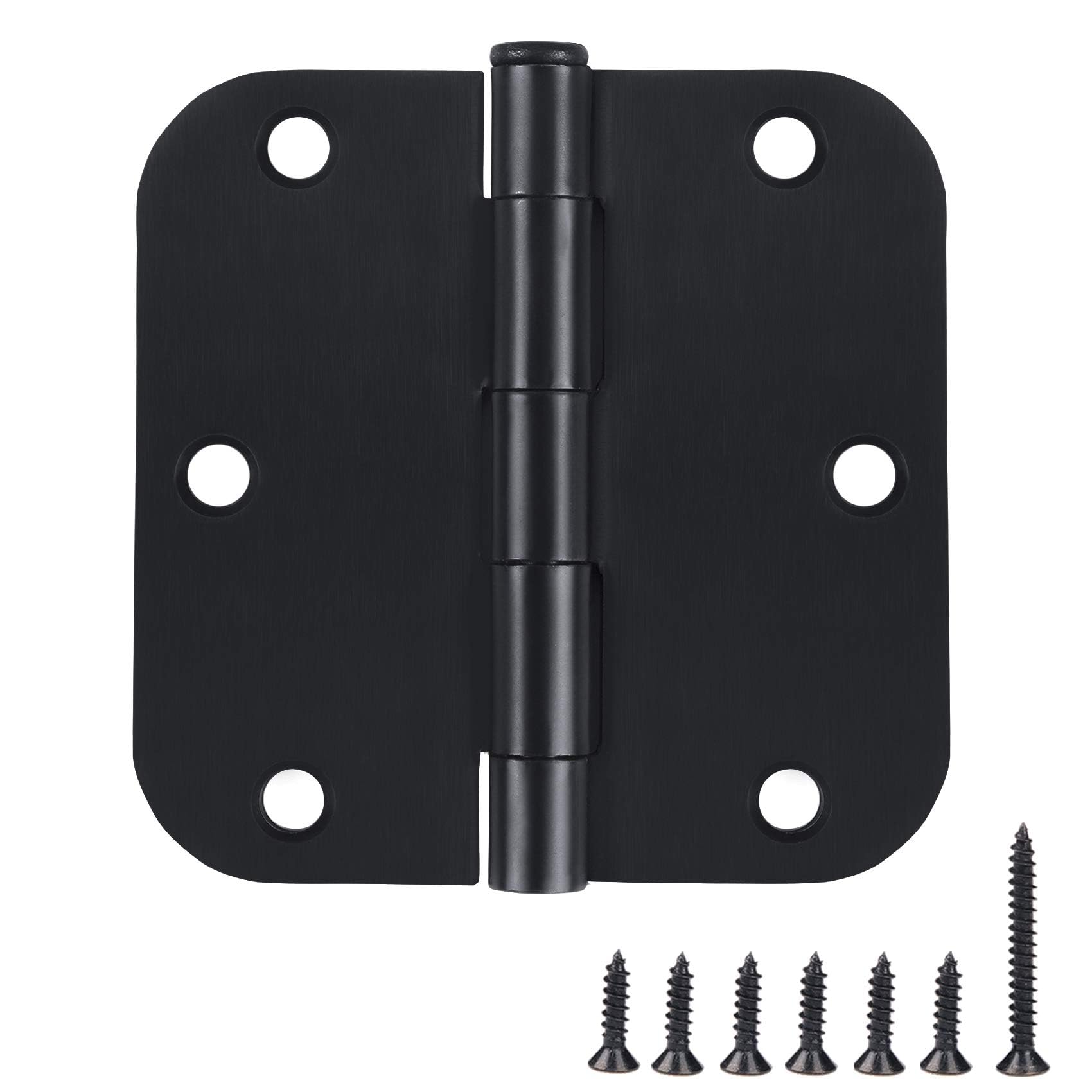 - KIW Door hinges Black Matte 3.5 inch with 5/8 rounded corners and 6 holes for front door, cabinet, wooden box. Safe black door hinges 3.5" Includes 18 free screws for quick and easy installation. Mat black door hinges can be rotated 270 degrees.