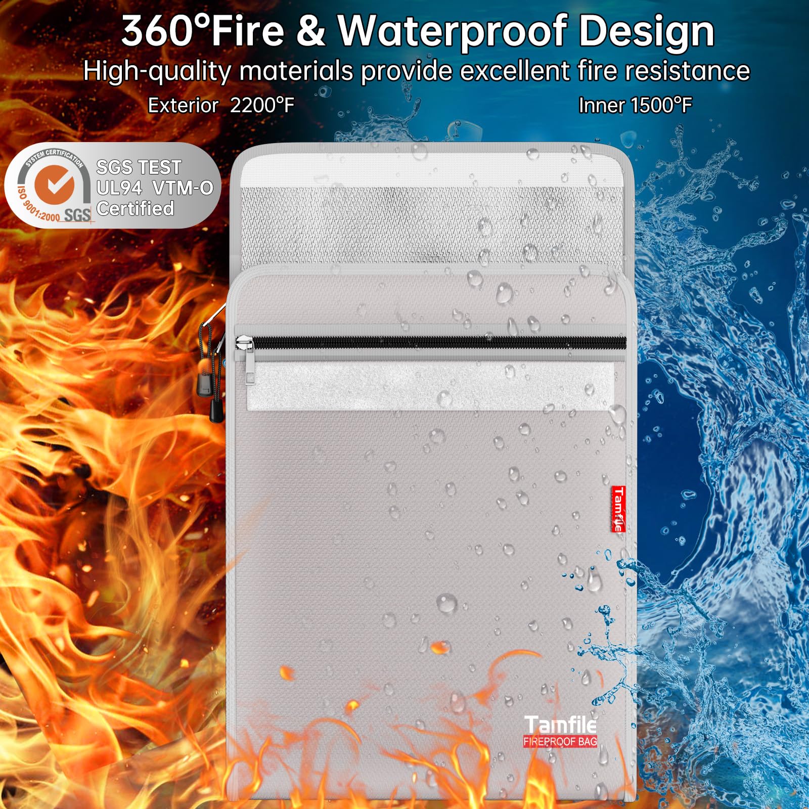 - [UL94 VTM-0 Burning Test Certification] Tamfile fireproof document bag, non-itchy for external use, stable quality, flame retardant fiberglass fabric on the outside, aluminum foil and heat-resistant waterproof material on the inside, with fireproof stitching, newly designed and produced, just to protect your property safety, passed UL-94 VTM-0 burning test. Double pocket waterproof and fireproof protective storage bag, suitable for A4 A5 legal letter size, cash, valuables and legal documents.