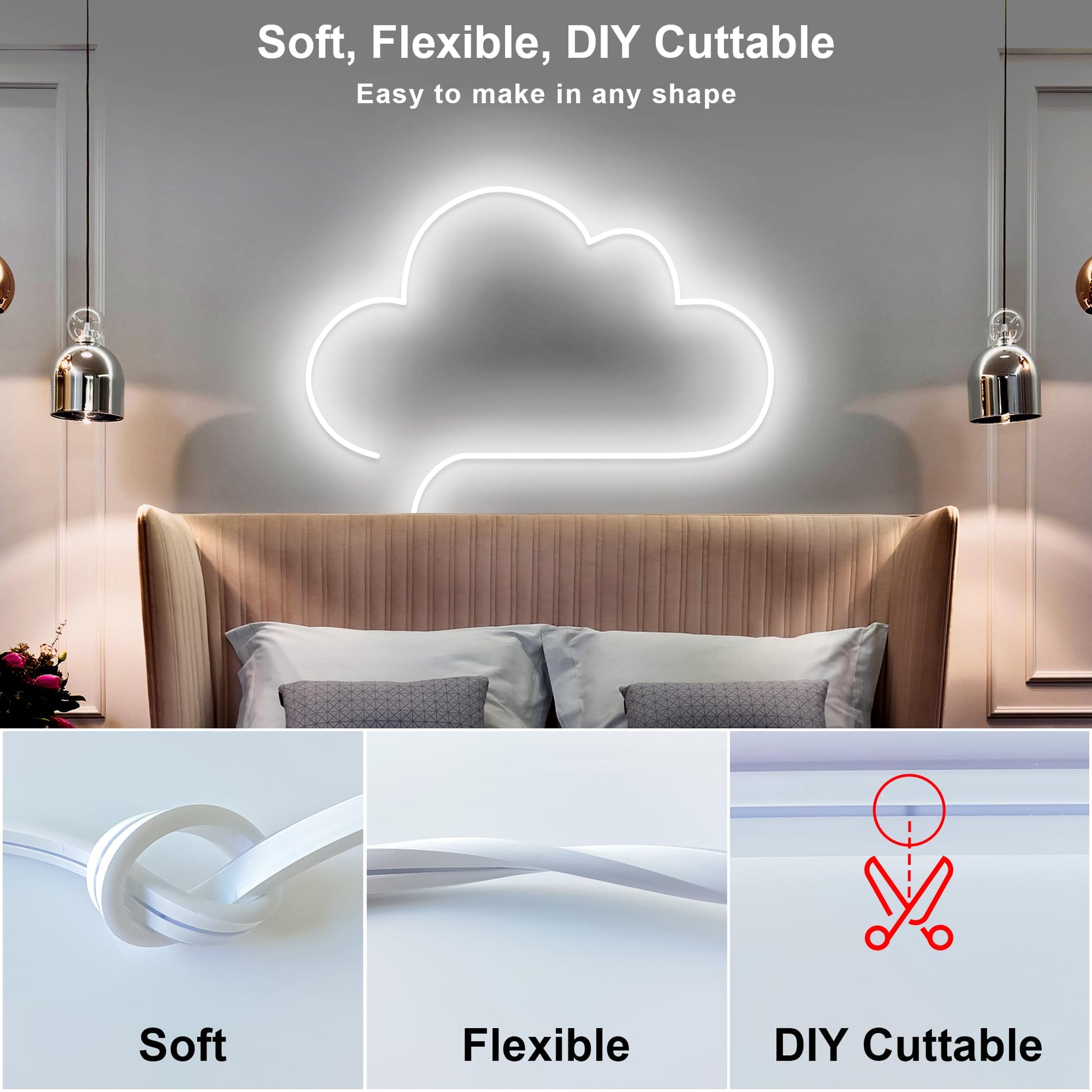 - 【Flexible & DIY Cuttable】This LED neon rope light is made of silicone which is more flexible than PVC , easy to make in any shape. You can use it to DIY special home decoration or design unique commercial sign (Cut in the black wires and the part connect to the cotroller can continue to work, and install a protective cover to maintain the IP67 level and prevent leakage).