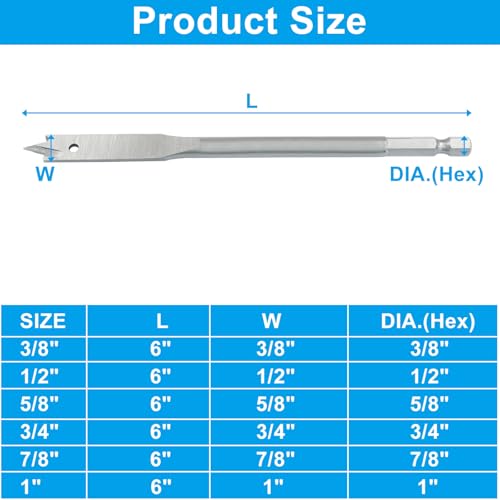 - Comprehensive Size Range: This 6-piece flat wood spade drill bit set includes sizes 3/8", 1/2", 5/8", 3/4", 7/8", and 1", providing versatile options for all your drilling needs.