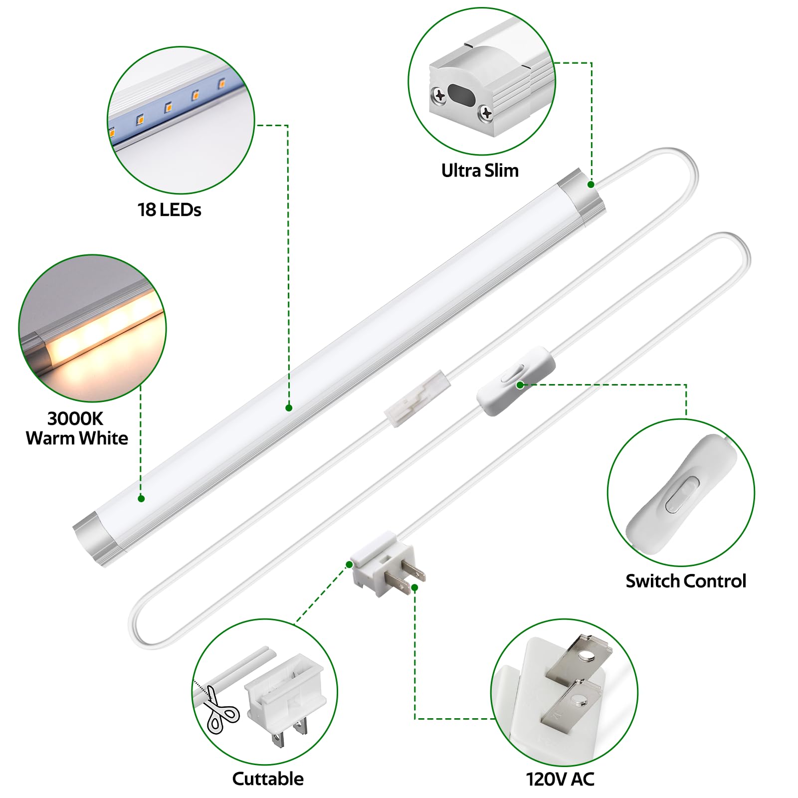 - 【Detachable & Cuttable】Equipped with a detachable plug, the wall plug cord of 12’’ under counter lights is cuttable. You can cut the cable according to your requirement and reassemble the plug for your use.