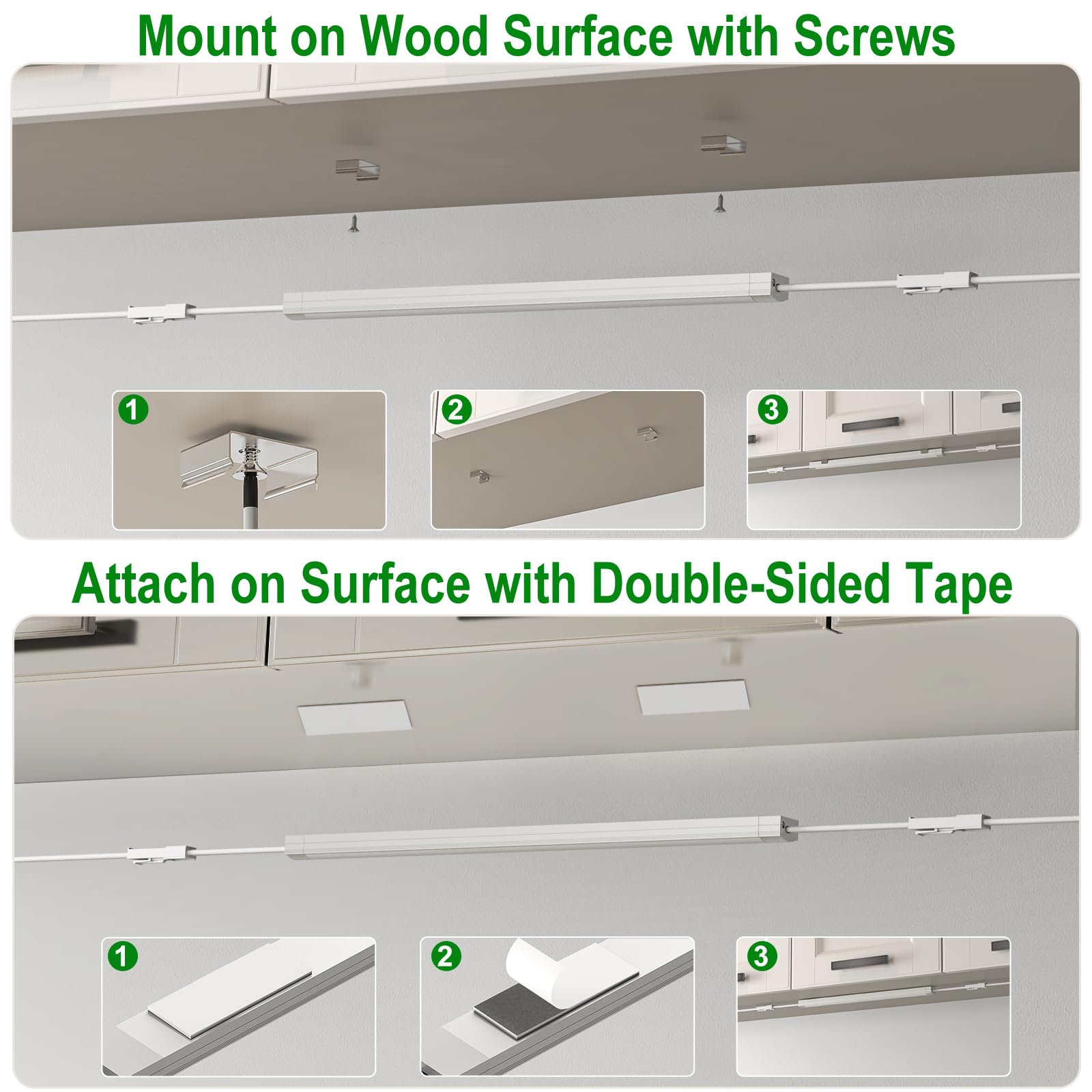 - 【Simple To Install】The cupboard lights could be installed with the screw mounting buckles and screws or doube-sided tape. Just mount the cabinet lights on wood surface with screws or attach the cabinet lights on surface with double-sided tape.