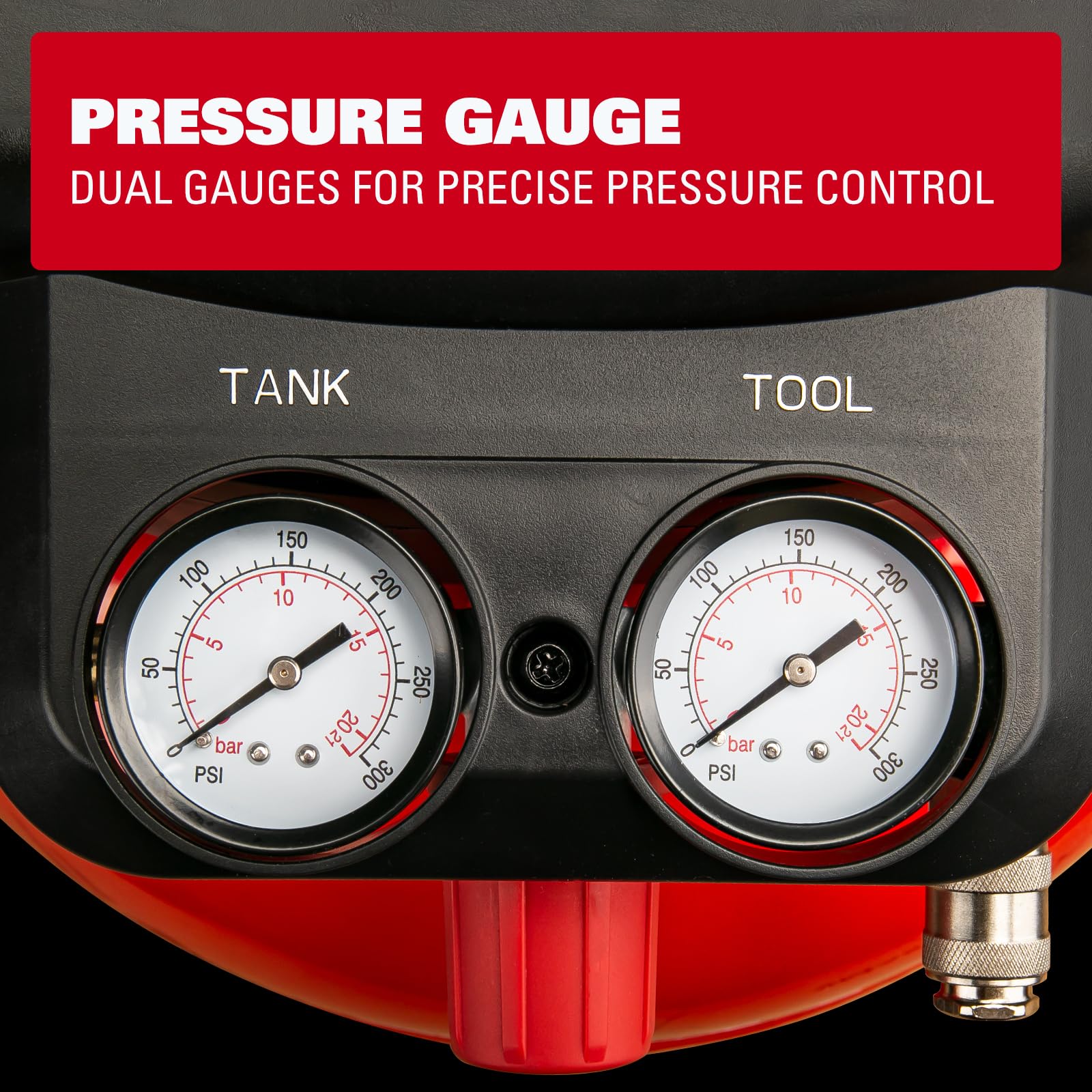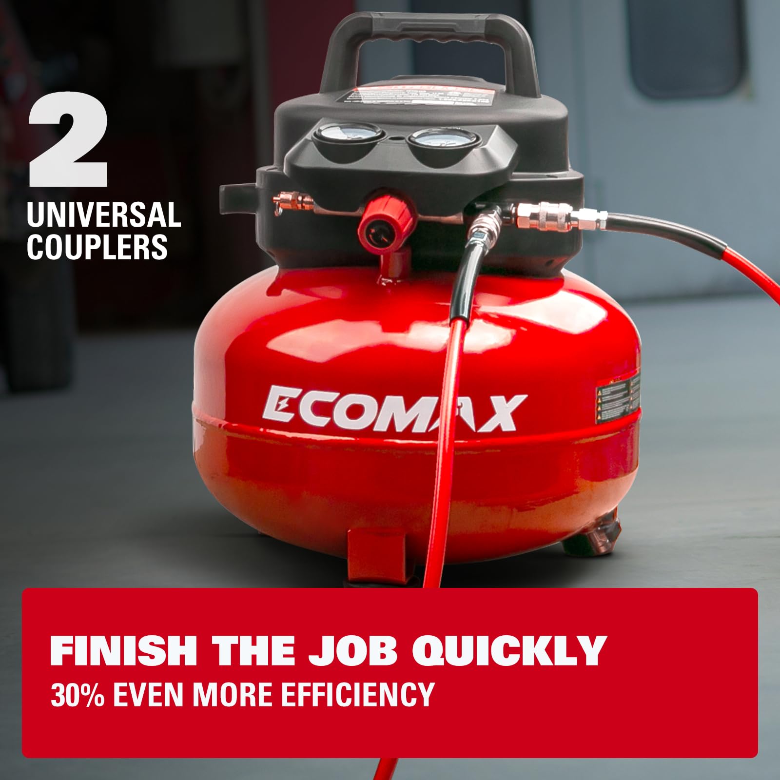 - Dual Quick-Connect Couplers: Equipped with two universal quick couplers, this air compressor allows you to connect and switch between air tools quickly and easily. Using two tools at once helps maximize efficiency and productivity on the job.