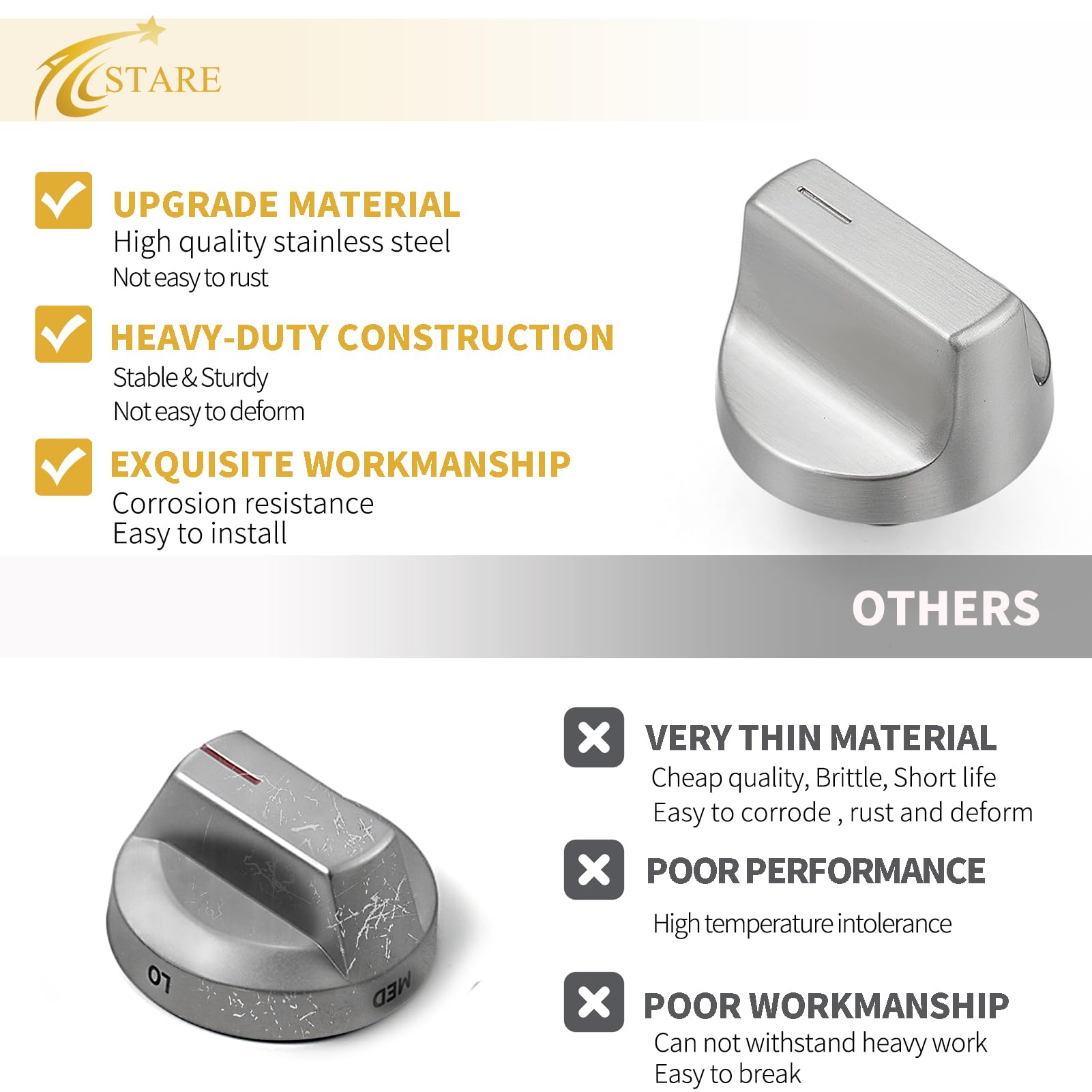 - 【UPGRADED DURABLE STAINLESS STEEL MATERIAL】 The whirlpool gas stove knobs are made of durable silver stainless steel materials, heavier and more durable than others. The whirlpool gas cooktop knobs have a smooth surface and a sturdy construction that will resist for years. Different from other materials, other materials are easy to rust, can not bear high temperature, easy to deform