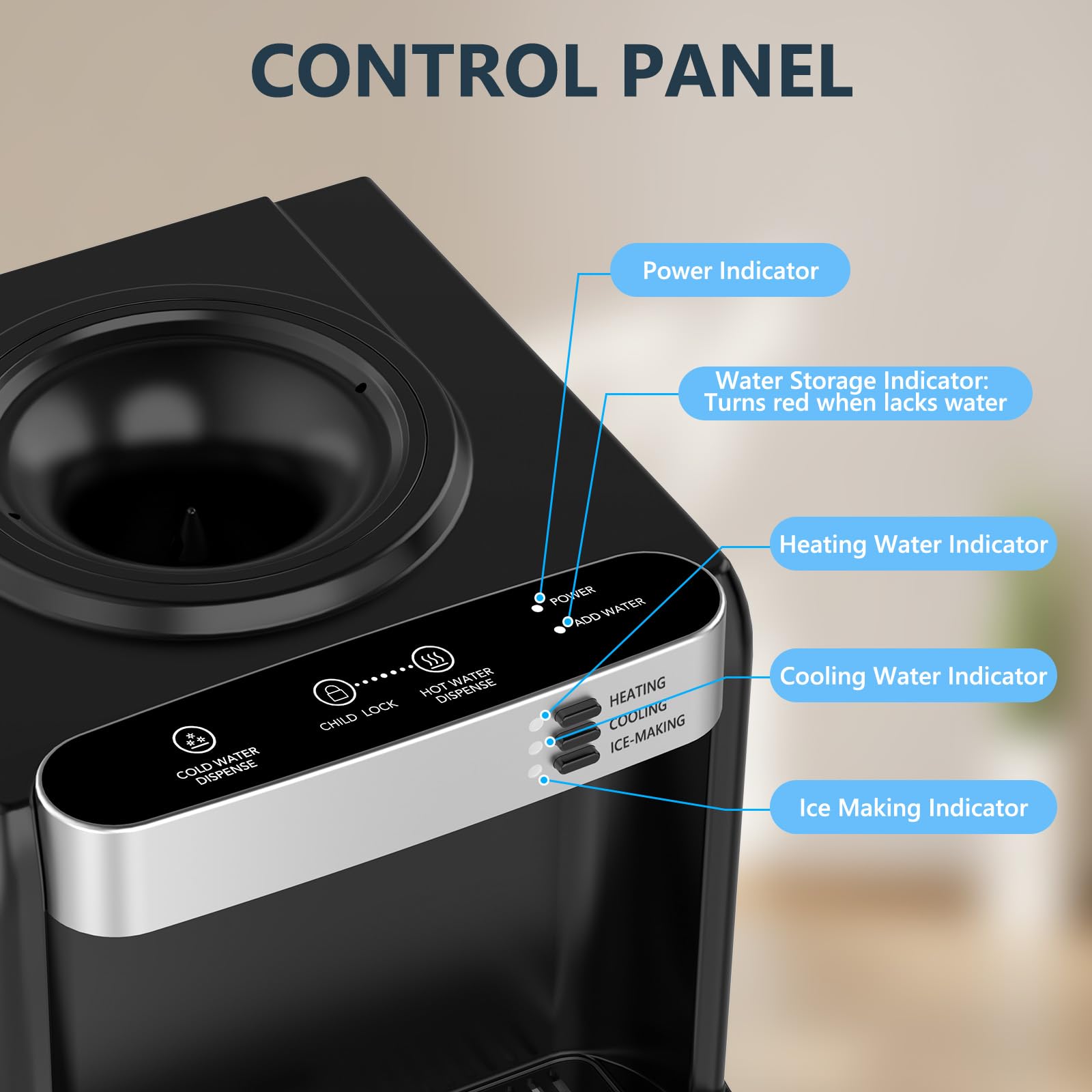 - Excellent Ice Making Capacity: Water cooler dispenser built-in ice maker, which is comparable to countertop ice makers on the market. It can produce up to 33 pounds meet your daily ice needs for cold drinks. Note: If there is not enough water to make ice, the ice maker will stop automatically and the warning indicator will light up. When the inside of the device is full of ice cubes, it will automatically stop working.