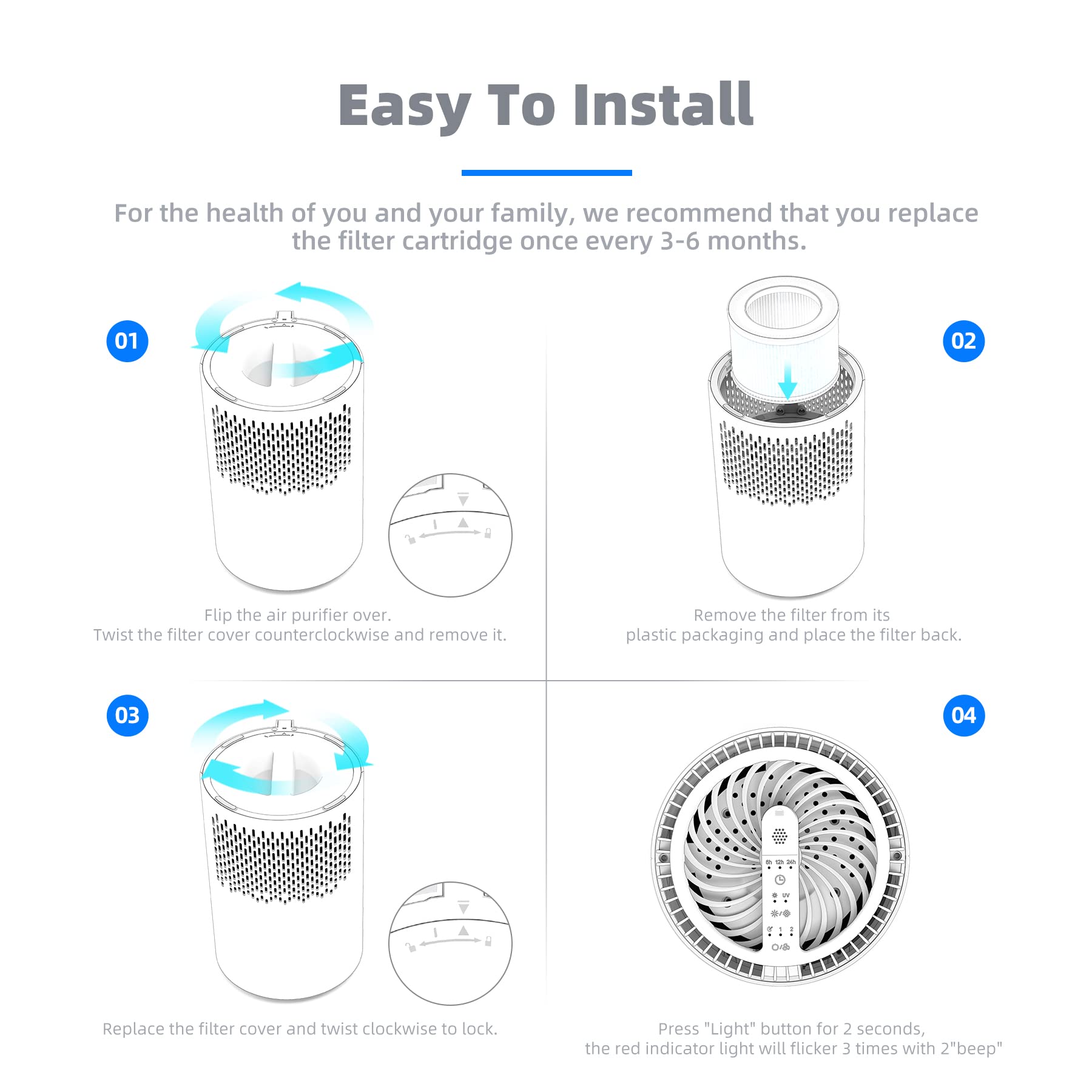 - Prevent Clogging: When hairs, dander, and other large particles meet the pre-filter layer, they will be blocked outside to prevent the air purifier from clogging.