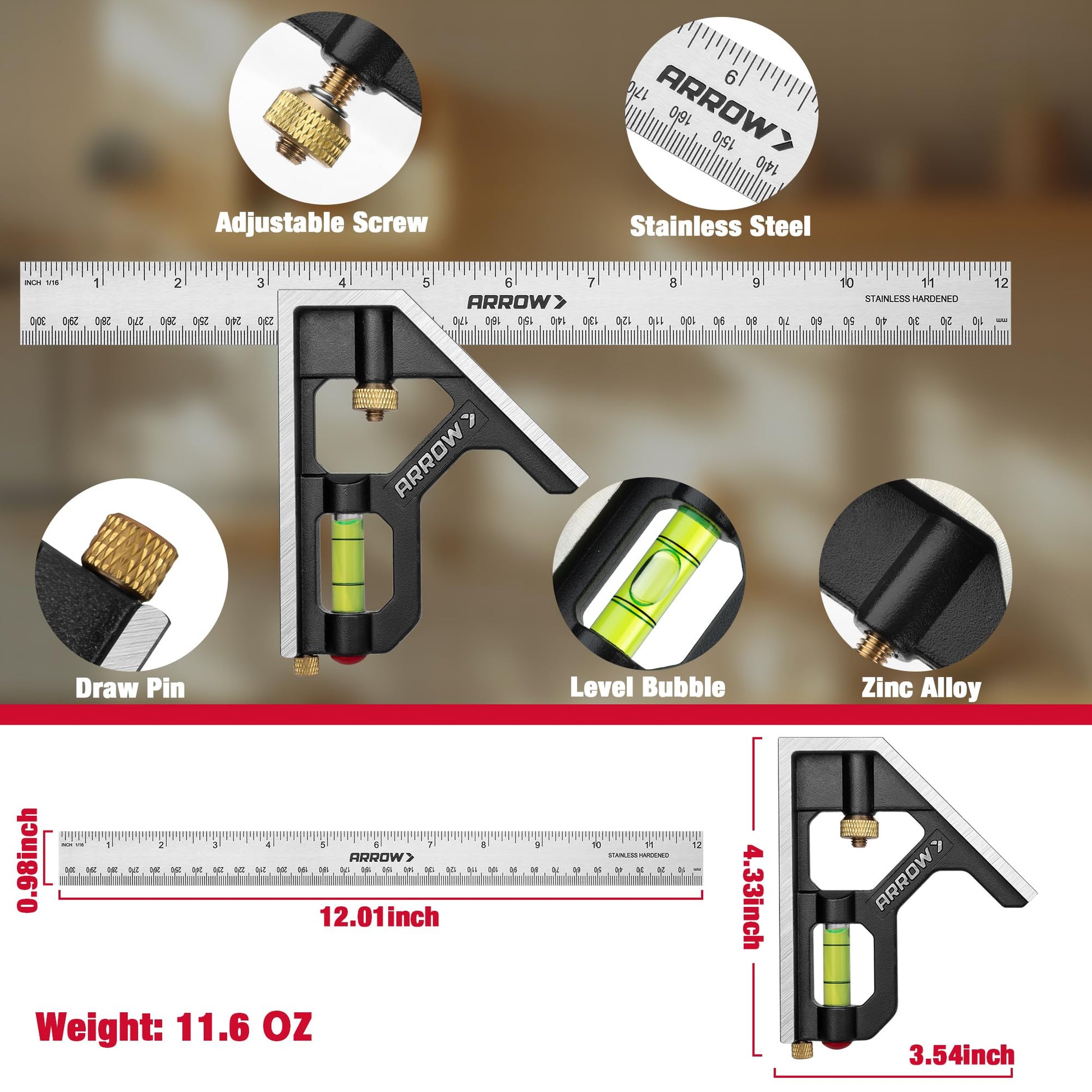 Arrow Combination Square, 12-Inch Combo Square with Stainless Steel Ruler, Zinc Alloy Body and Bubble Level for Carpenters and Craftsmen