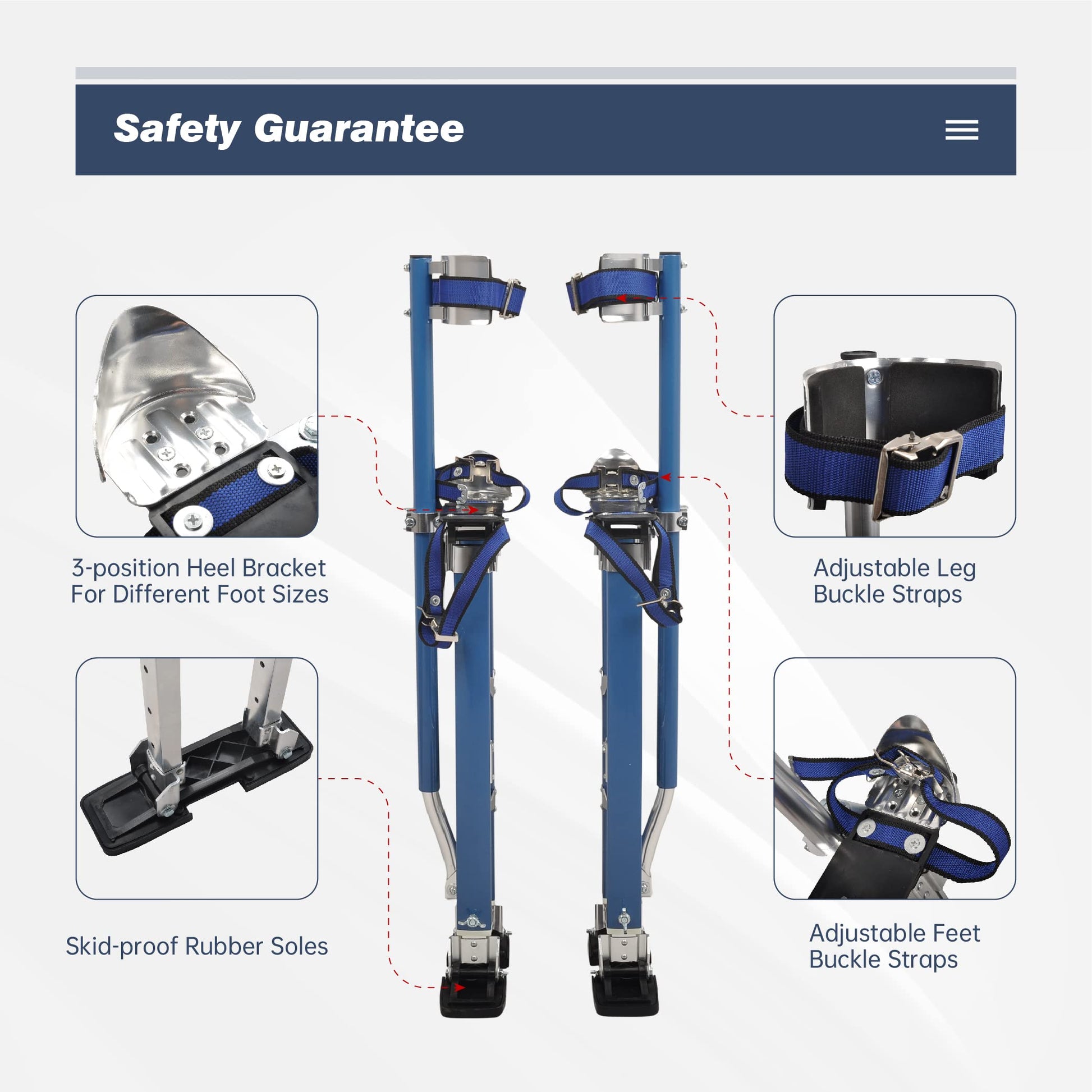 - Safety Guarantee: Anti Skid with premium rubber soles. Leg and shoe straps added safety with auto-locking buckles. Extra-wide padded calf braces plus three-position adjustable heel plates accommodate any user (stilts have 1 calf brace)