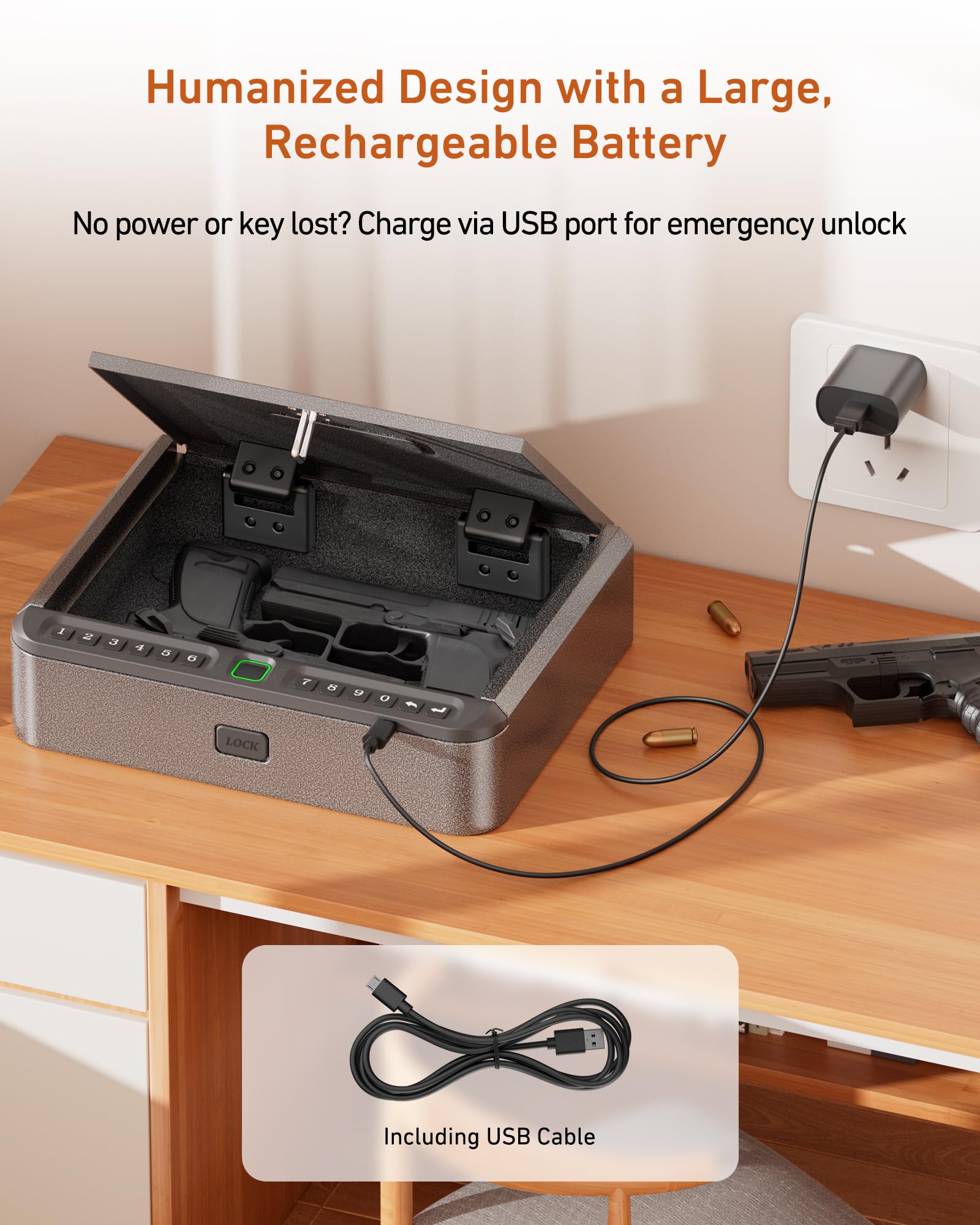 - USB Charging & Mute: The handgun safe has a 1800mAh large-capacity battery and a low-power consumption chip. It has an external USB charging port, which can be charged anytime, and has a low battery reminder function, so you don’t have to worry about battery power! Fingerprint safe also has a silent function and a user-friendly design, and you can also switch to silent mode according to your preference. A pistol safe with LED lighting makes picking up and placing items in the dark easier
