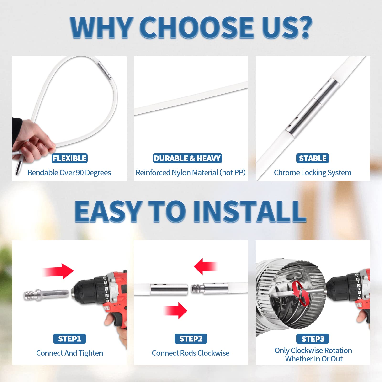 - ✔✔【EASY TO USE 】Just align the joints of the two poles and rotate them clockwise. The dryer vent cleaning kit is easy to connect and retract, and can withstand bending pipes above 90 degrees, which can be used with or without a power drill. Each dryer duct cleaning kit provides a metal drill attachment, which can be connected to the power drill to quickly & easily clean the dryer vents to help you achieve professional results.