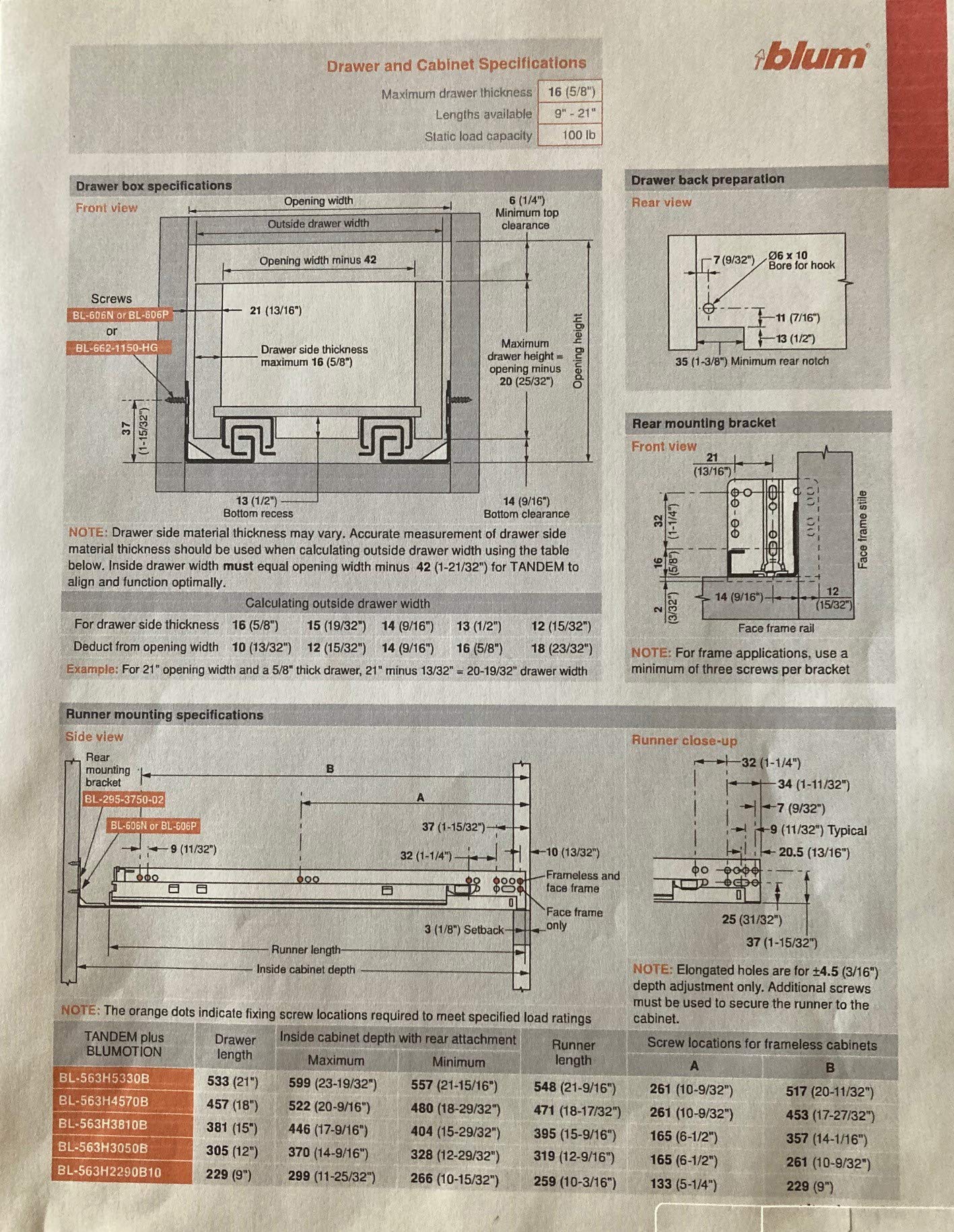 Details: Discover Blum Tandem plus Blumotion (Soft-Close) Complete Pair. With100 lbs static load-bearing capacity, full extension and soft closing. The drawer slide can be four-dimensional adjusted and has elongated holes for depth adjustment & bottom mount holes that allow you to mount the slide to a shelf or the bottom of the cabinet. Blum Tandem fits 1/2" - 5/8" drawer side thickness. The Complete Pair is supplied with 2 563H5330B runners (left and right), 2 T51.1801 locking devices (left and right), 2 rear brackets (needed for face frame only application) and screws.