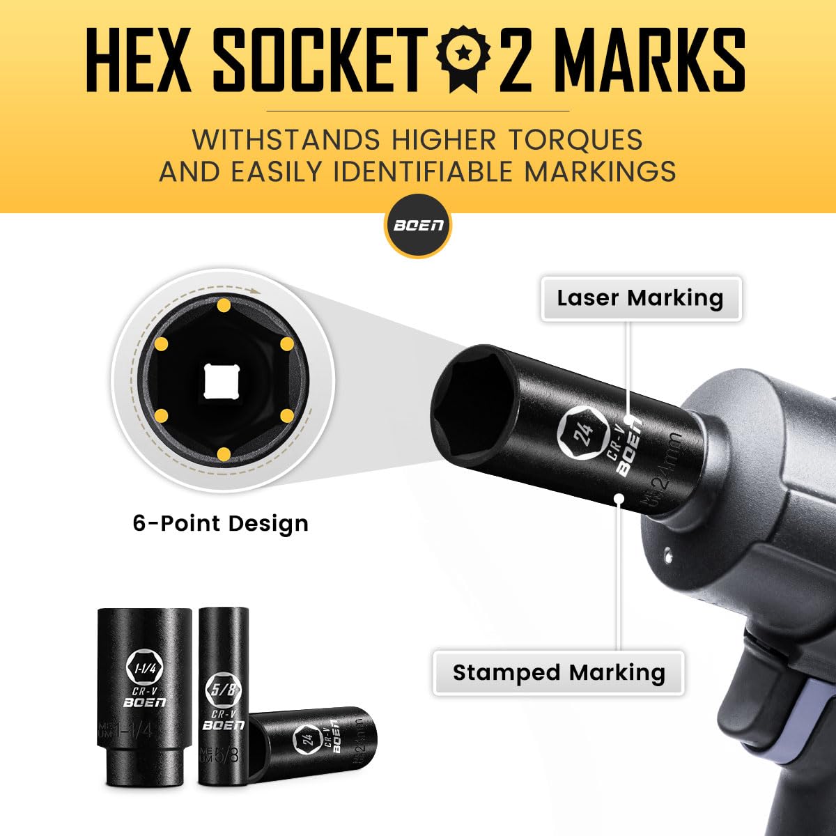 - DURABLE & STAMPED MARKING: Different from the traditional black oxide coating, BOEN deep impact socket set 1/2 dirve adopts black manganese phosphate coating to provide excellent corrosion resistance and rust resistance for long-term use. Laser markings and stamped markings make all model numbers easy to keep, read and quick identification