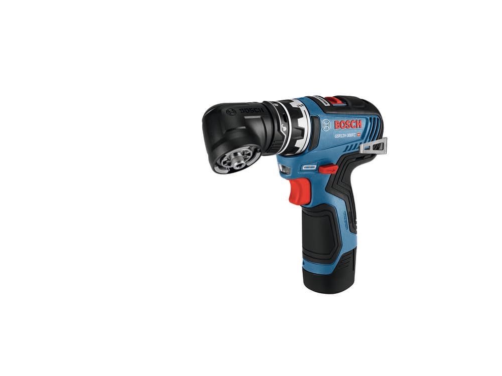 Details: This BOSCH 12V Max Flexiclick 5-In-1 Drill/Driver System features an efficient EC Brushless motor for max runtime and upgraded power – 300 In. -Lbs. of torque. The GSR12V-300FC is designed for professionals who want a high-quality tool that redefines their limits to get the tough jobs done. At only 1. 2 Lbs. (tool only, not including battery) and a max speed of 1, 750 rpm, this robust drill/driver delivers the performance you expect in the size you want. It has two speed settings – a 0-460 rpm for high-power driving tasks and 0-1, 750 rpm for high-speed drilling. It starts with a magnetic bit holder for basic driving. The four attachments – a locking bit holder, a keyless chuck, an offset-angle and a right angle– each attach to the tool securely and easily with the One-Click interface. The right-angle attachment is for tight spaces, and it works with all three other adapters. The offset-angle attachment delivers precise screwdriving close to edges. Both of these attachments rotate to 16 positions without removing them. The locking bit holder attachment locks hex bits for high-torque drilling, while the keyless chuck provides locked-in drilling.