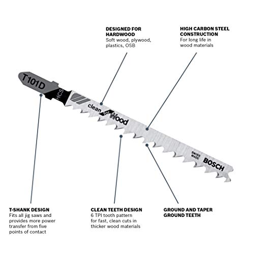 Bosch T101D 5-Piece 4 In. 6 TPI Clean for Wood T-Shank Jig Saw Blades