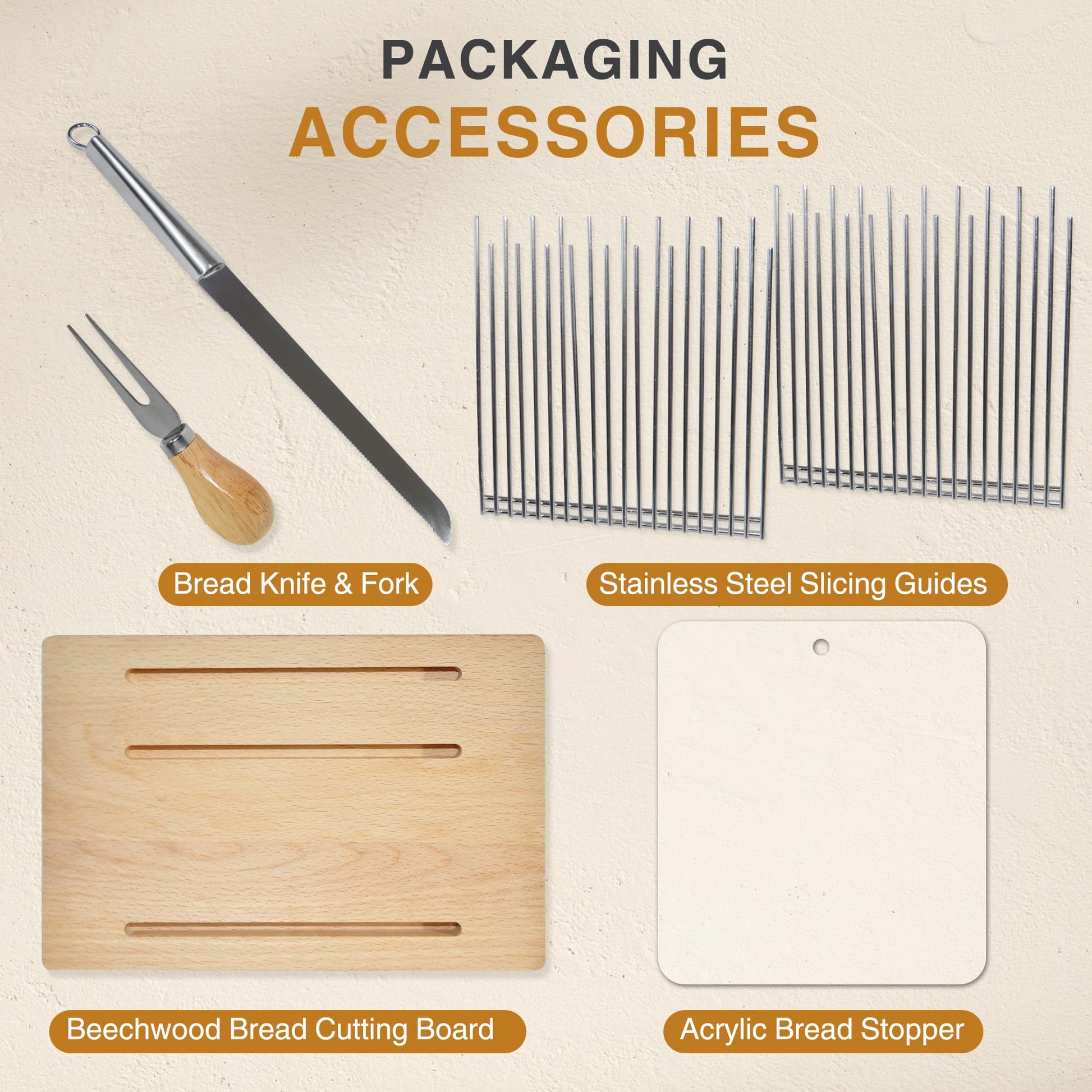 - STAINLESS STEEL SLICING GUIDE: Our bread slicer features an adjustable stainless steel slicing guide that is more durable and easier to clean than traditional wooden guides. Unlike wooden guides that can wear down and risk leaving wood particles in your bread, our stainless steel design eliminates this concern. It's abrasion-resistant, easy to maintain, and the perfect companion for slicing bread with precision and convenience