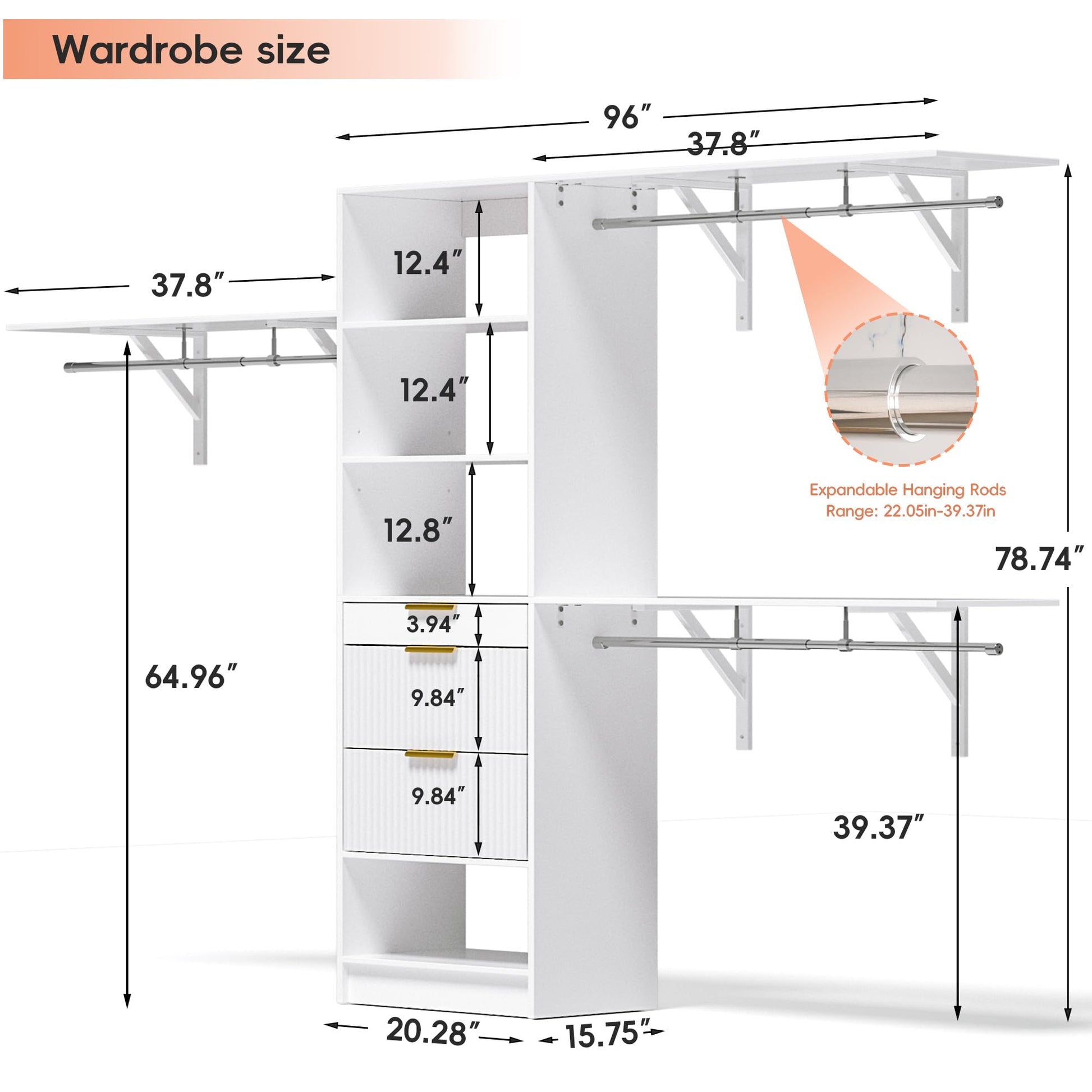 Closet System, 8FT Closet Organizer with 3 Wooden Drawers, Walk-in Closet Wardrobe Clothes Rack with 3 Expandable Hanging Rods, Garment Rack, White