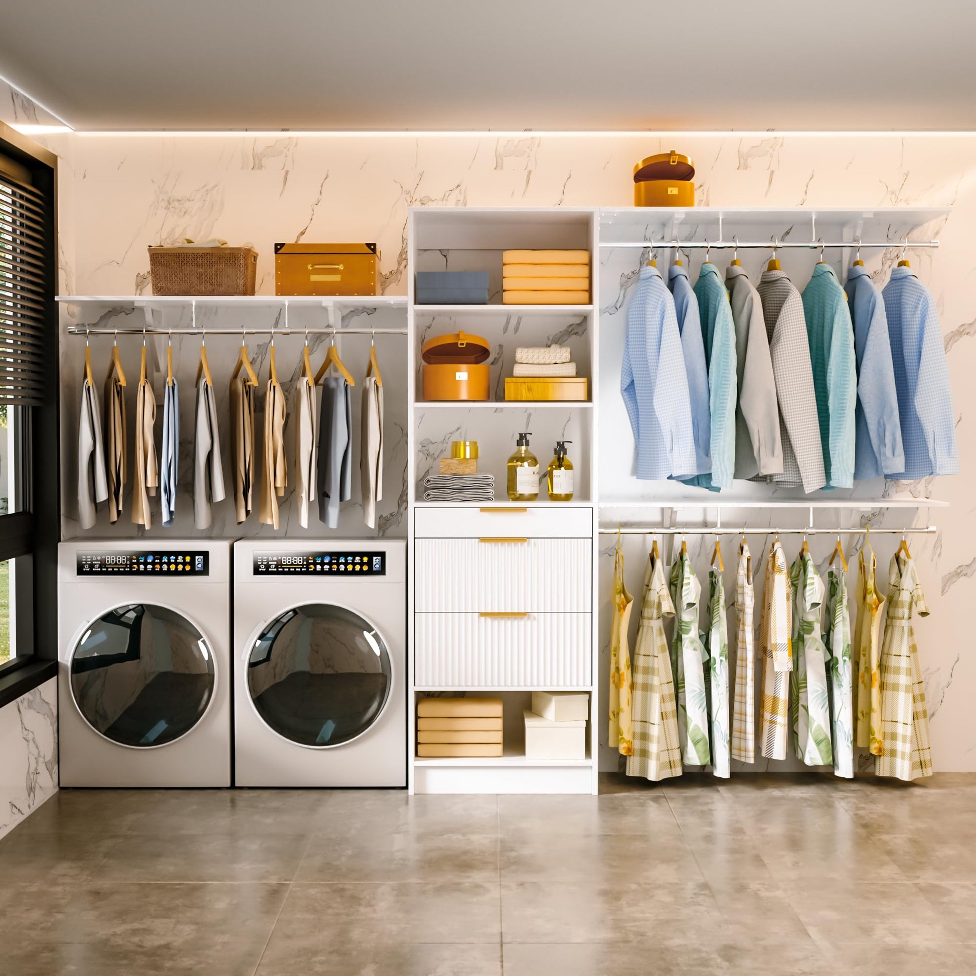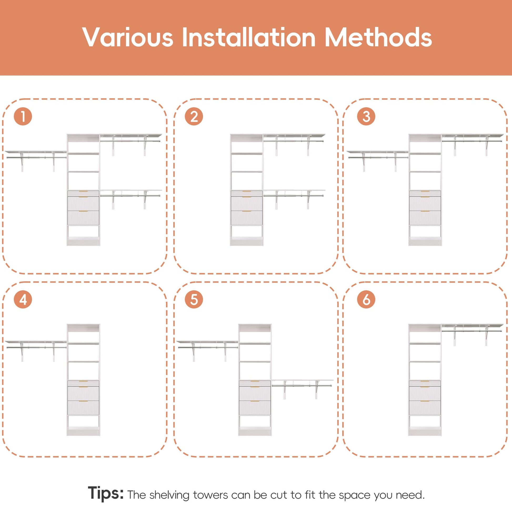 - Customizable and Flexible Walk-in Closet: With 3 expandable hanging rods, you can easily create a personalized walk-in closet system tailored to your space. It can fit the 5 feet to 8 feet wide closets (the shelving towers can be cut to fit), and the hanging rods can expand from 22 inches to 39 inches. You can cut down components for tighter spaces or combine multiple units to expand your storage capabilities, making it suitable for both walk-in closet systems and built-in closet organizers.