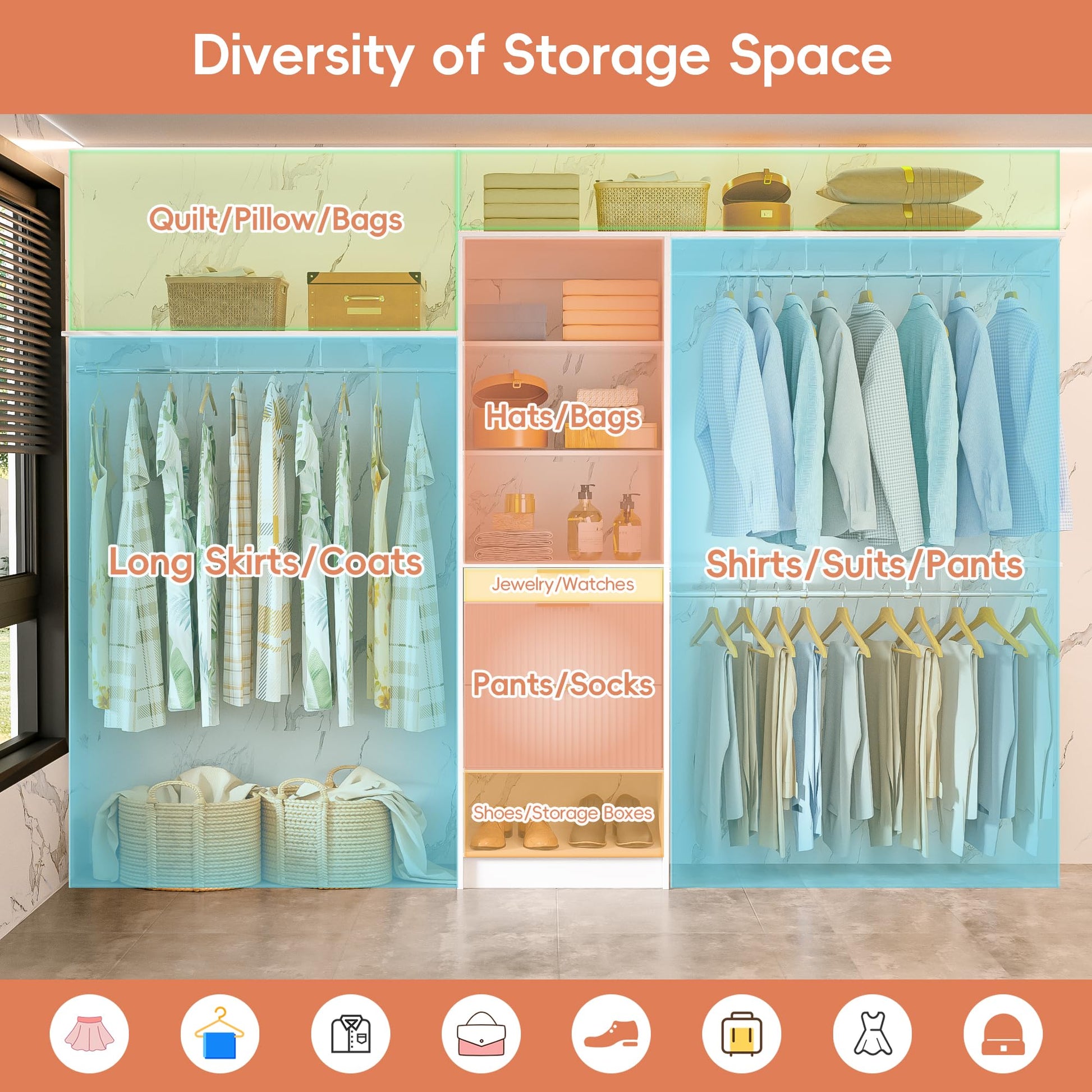 - 8FT Closet Organizer System: The wooden closet system provide spacious space to organize and storage your essentials. 3 spacious hanging areas for organizing long dresses, coats, shirts and pants; 3 open shelves to store bags, hats; 2 large wooden drawers for discreetly storing undergarments and personal items; the top shelf is perfect for pillows, quilts, suitcases and boxes. The bottom area keeps shoes organized and accessible.