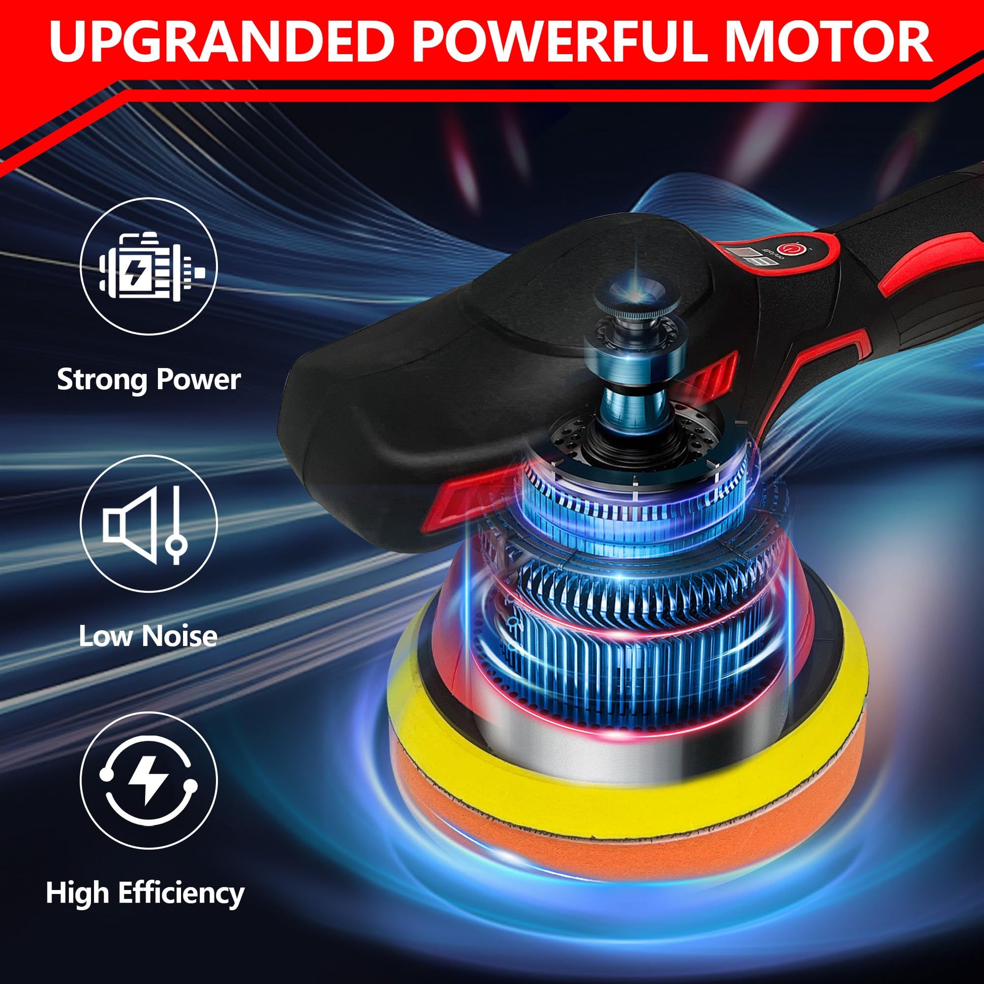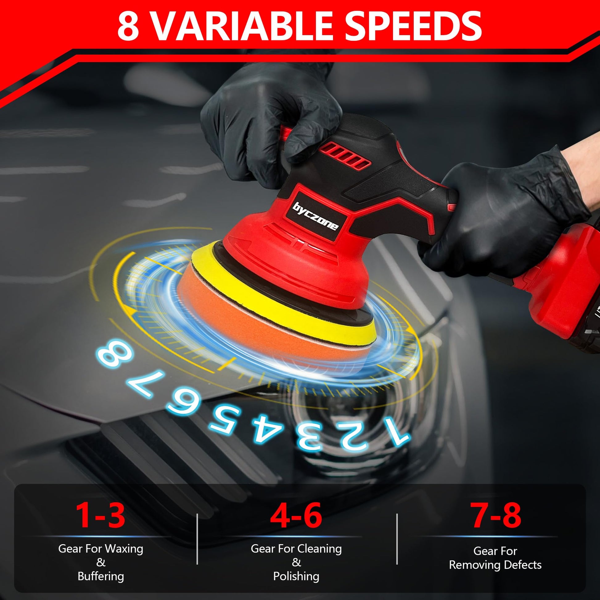 - 【8 VARIABLE SPEED】--- Our cordless car buffer polisher features 8-speed adjustments, ranging from 550 to 5000RPM. The low speed is suitable for waxing and buffing, the medium speed for polishing and cleaning, and the high speed for removing paint defects and oxidation. This cordless car polisher ensures that it can meet your needs whether you're dealing with delicate surfaces or demanding correction tasks.