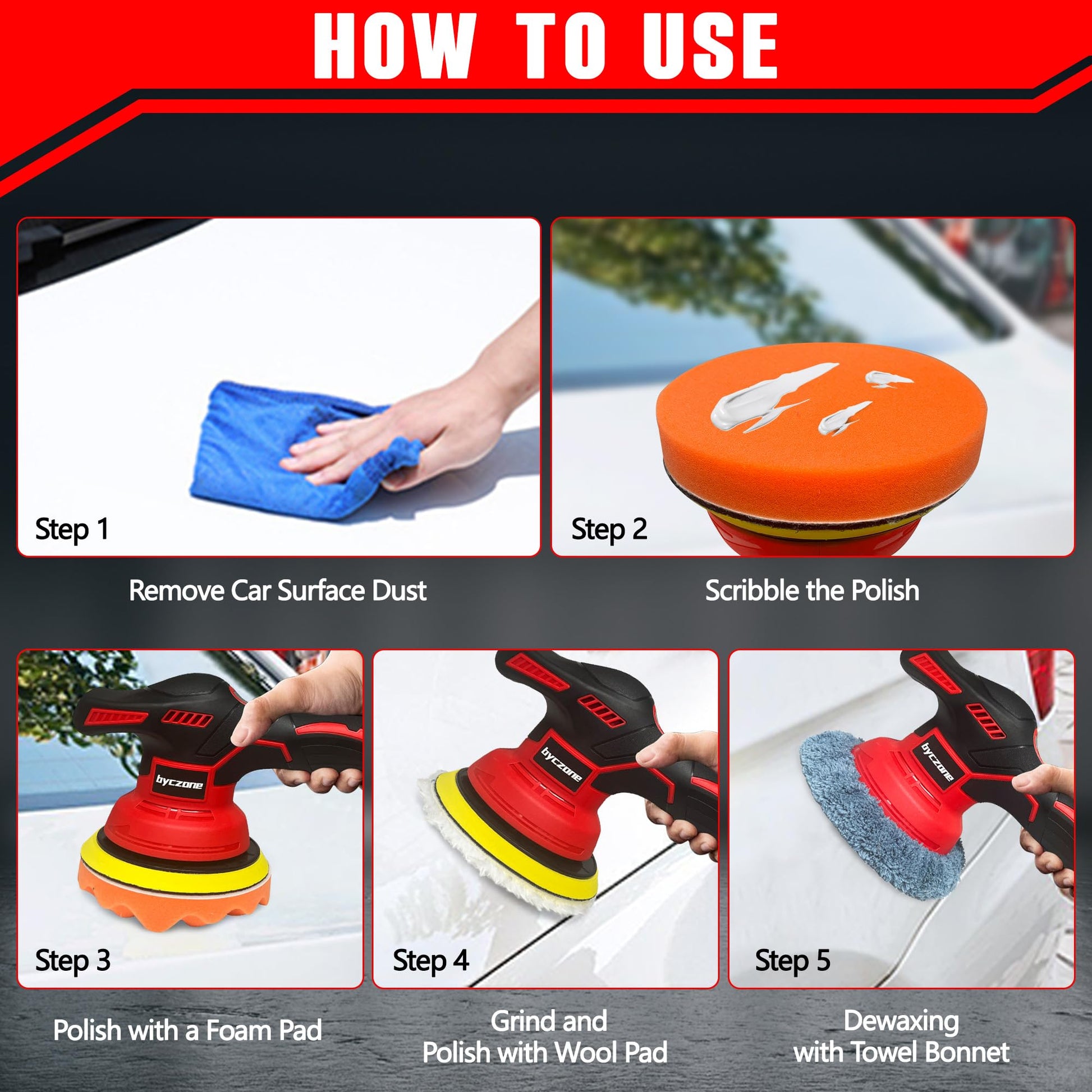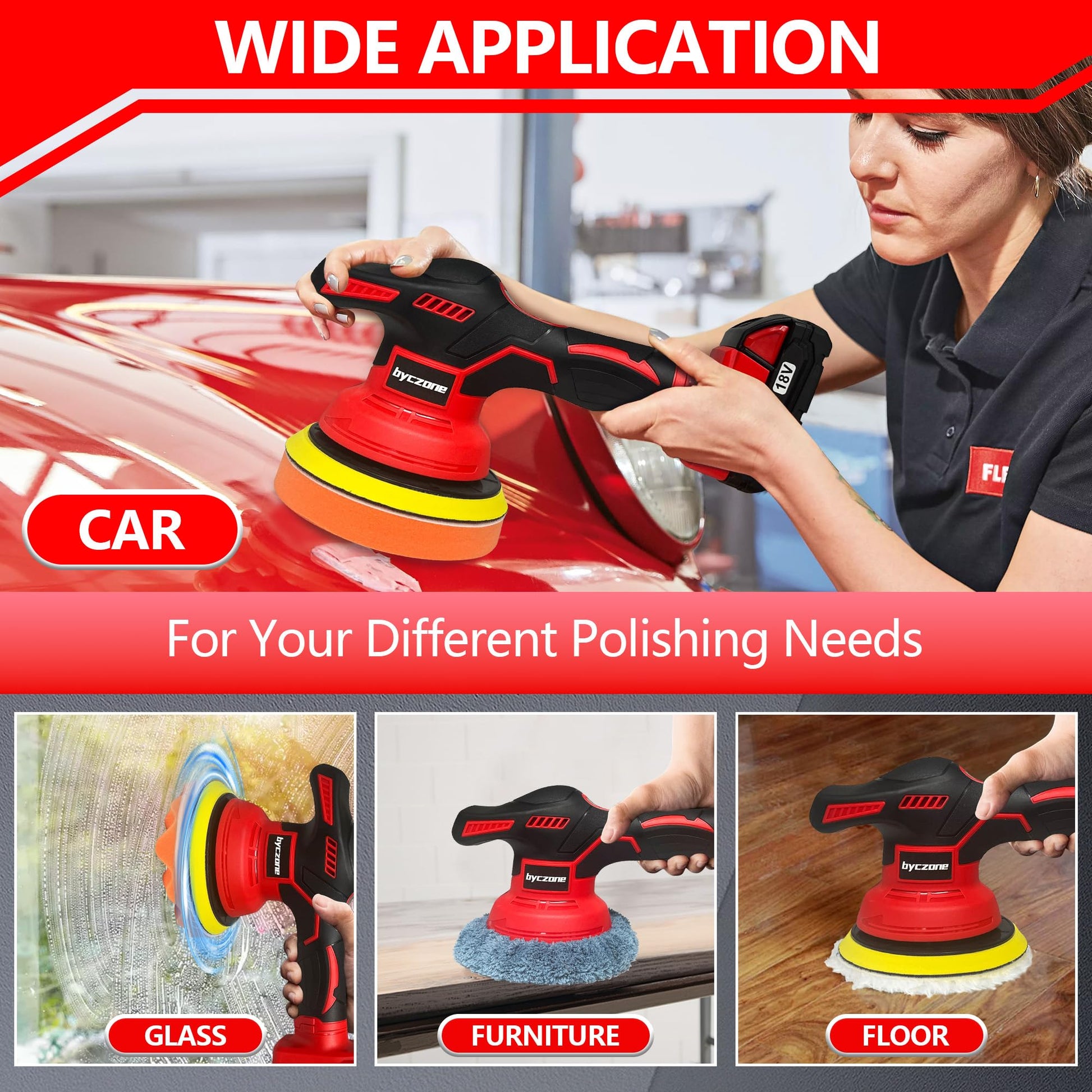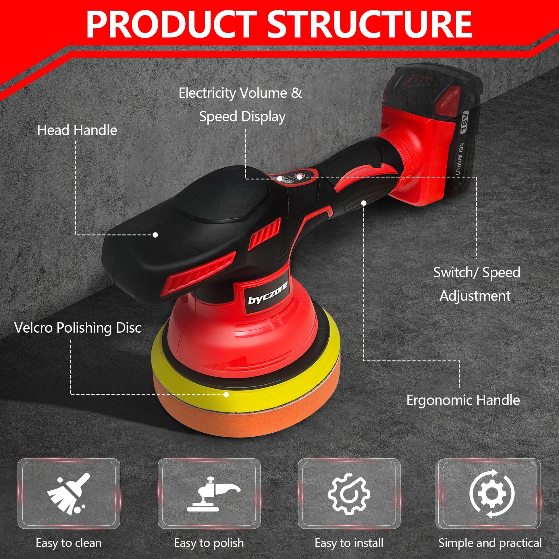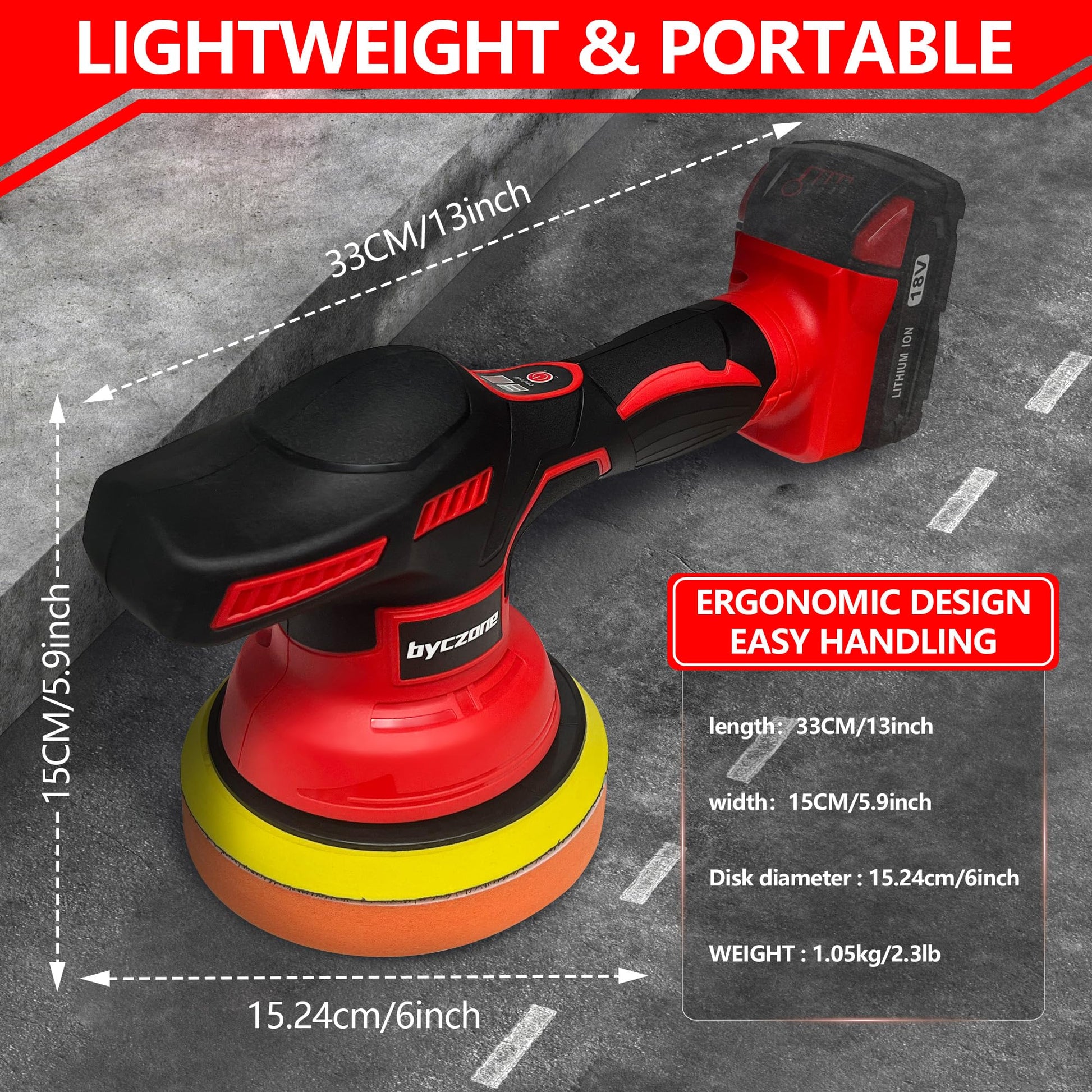 - 【ERGONOMIC DESIGN & LIGHTWEIGHT】--- Experience perfect balance of power and comfort with the lightweight and ergonomic design of the byczone mini polisher. Weighing only 2.3 lbs, it's easy to carry and store. The ergonomic rubber handle of the wireless car polisher ensures a secure grip and allows for precise control; perfect for beginners, DIY enthusiasts, or professionals in the auto care industry.