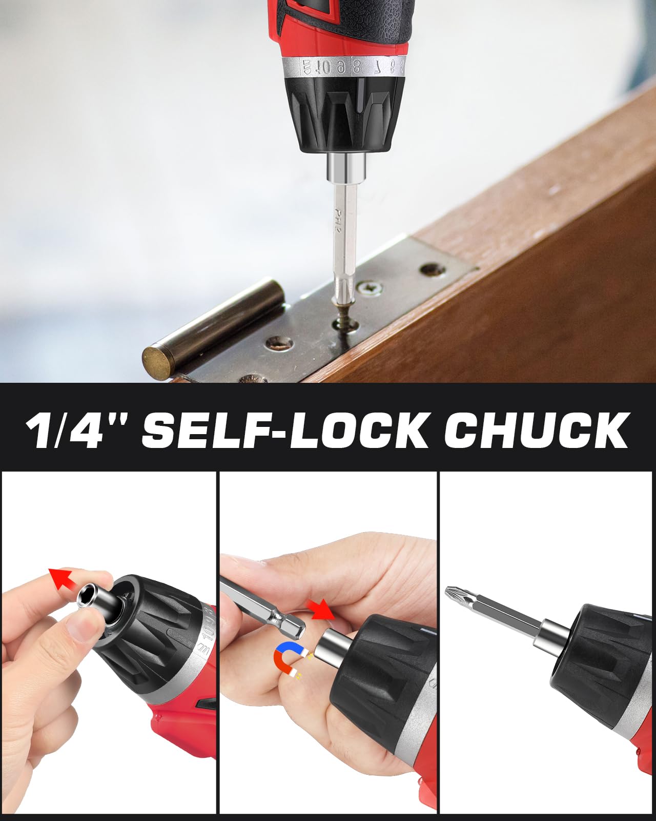 - 𝟐-𝐩𝐨𝐬𝐢𝐭𝐢𝐨𝐧 𝐇𝐚𝐧𝐝𝐥𝐞 & 𝟏/𝟒" 𝐇𝐞𝐱 𝐂𝐡𝐮𝐜𝐤: DuroFort electric screwdriver features a dual-position handle, allowing for both pistol-grip and in-line operation. Customize the ergonomic handle to fit your hand comfortably, enhancing ease of use. This adaptability makes the screwdriver versatile for various tasks. The integrated 1/4" bit holder ensures quick and easy bit changes, reducing hassle
