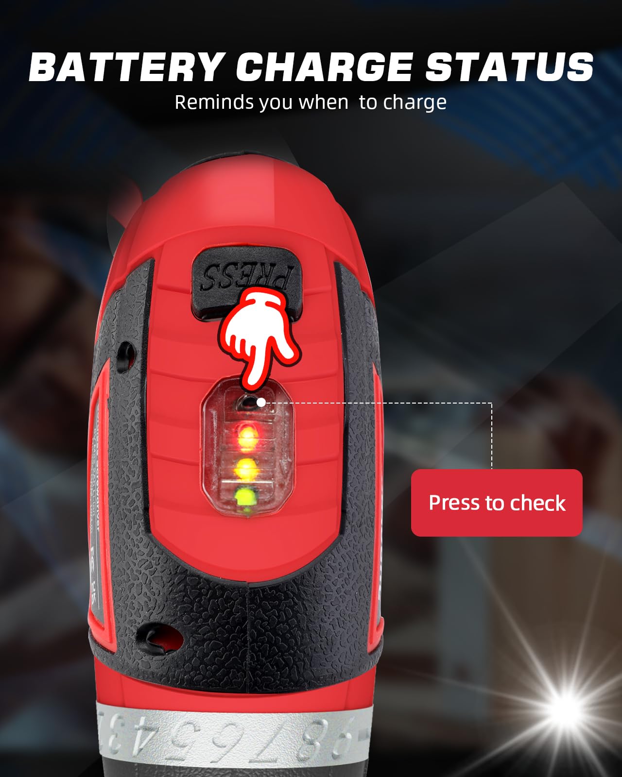 - 𝟐𝟎𝟎𝟎𝐦𝐀𝐇 𝐑𝐞𝐜𝐡𝐚𝐫𝐠𝐞𝐚𝐛𝐥𝐞 𝐁𝐚𝐭𝐭𝐞𝐫𝐲 & 𝐁𝐚𝐭𝐭𝐞𝐫𝐲 𝐒𝐭𝐚𝐭𝐮𝐬 𝐈𝐧𝐝𝐢𝐜𝐚𝐭𝐨𝐫: DuroFort electrician screwdriver features a powerful 2000mAh lithium-ion battery, providing long-lasting performance and extended usage. It fully recharges in just 1 hour. For added convenience, a clear battery status indicator helps you monitor the remaining charge, allowing you to plan your tasks effectively and avoid unexpected power loss