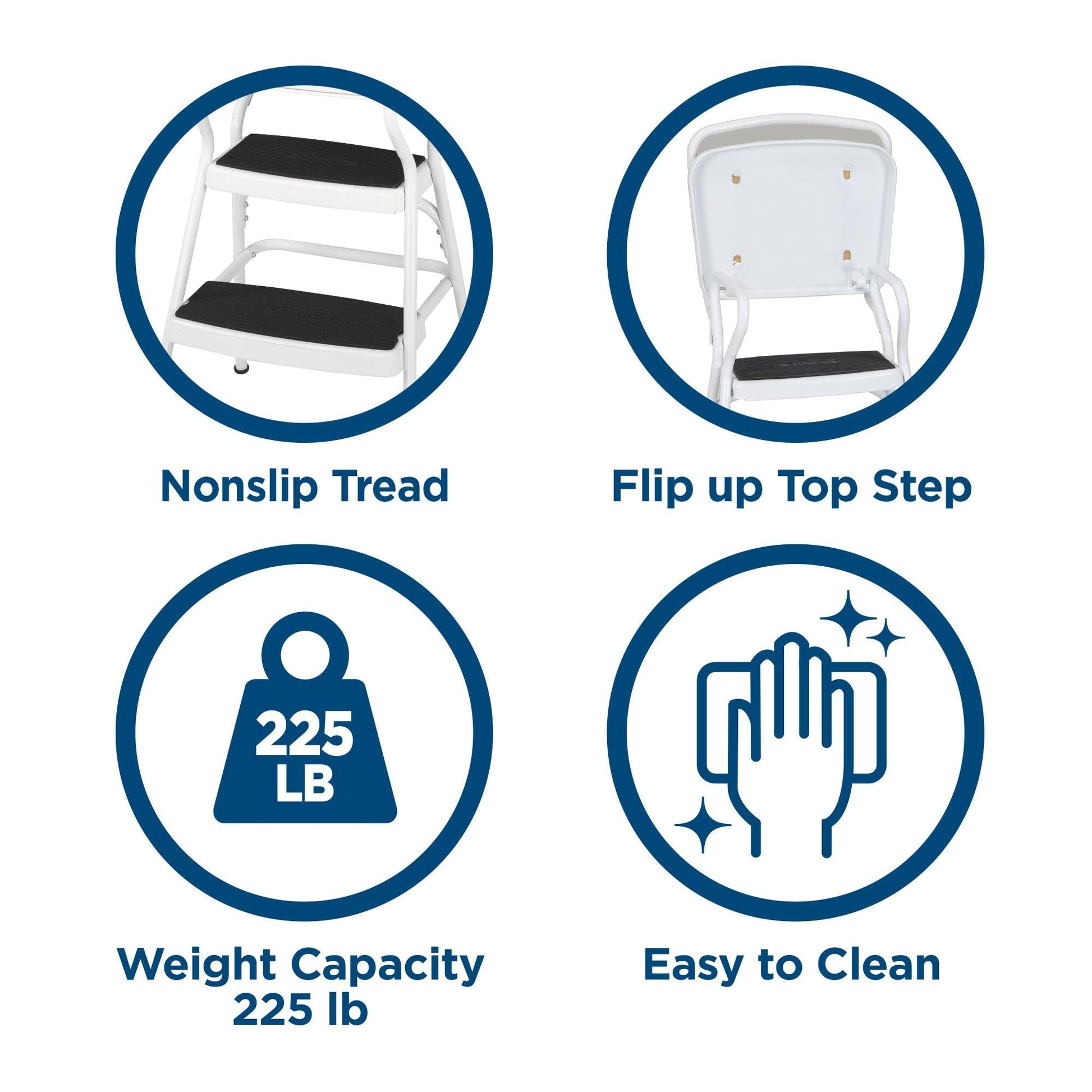 - FLIP-UP SEAT - Seat quickly flips up to transform chair into a step stool