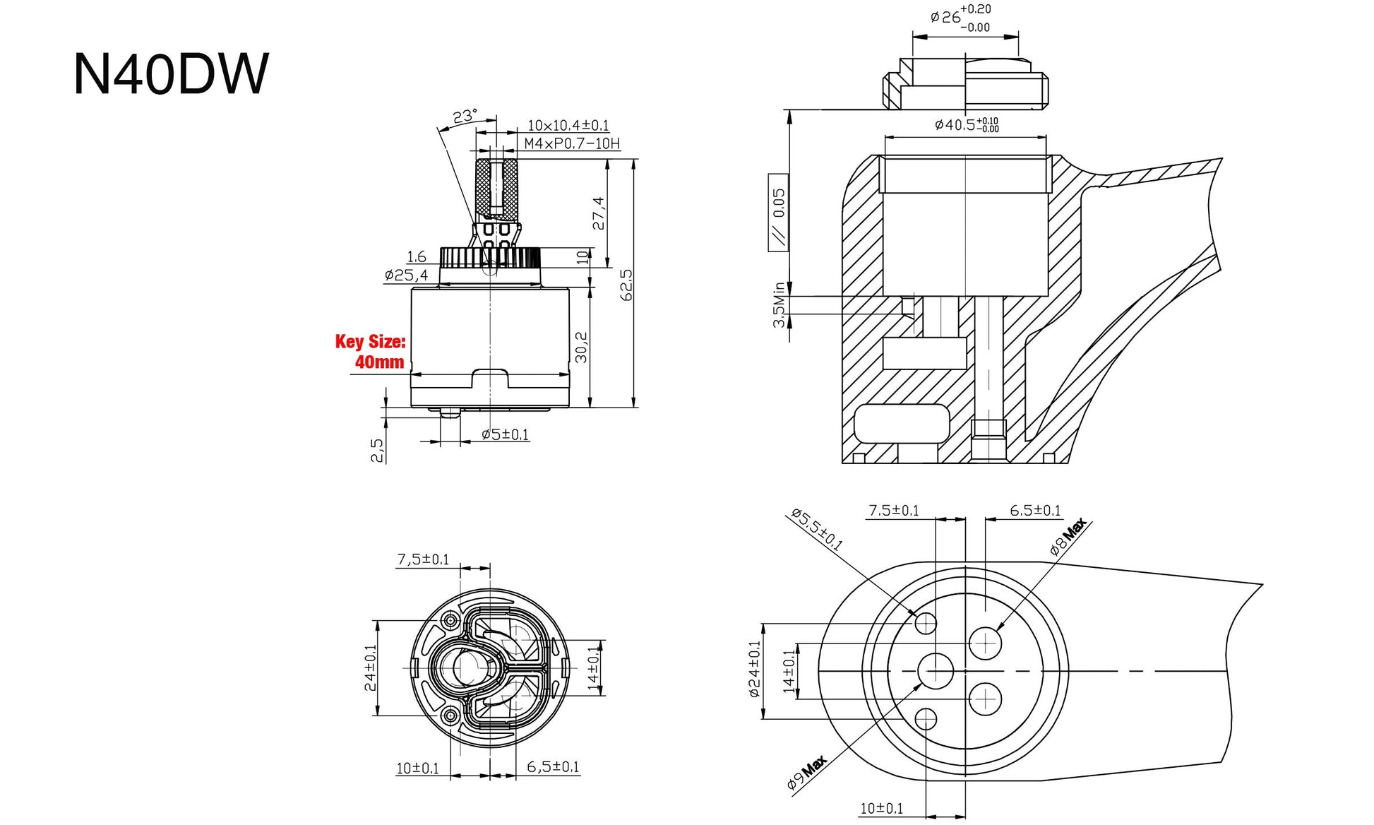 - N40DW-Standard 40 mm square stem ceramic disc cartridge for various single handle faucets.