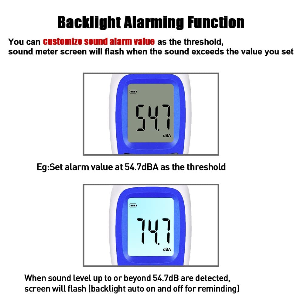 - 【User Friendly Design】Sound meter features backlight alarm, large LCD display, maximum/ minimum noise monitor, data hold function, auto/manual power off, disable the auto off function, sound level meter can continuously measure noise value, battery indication.