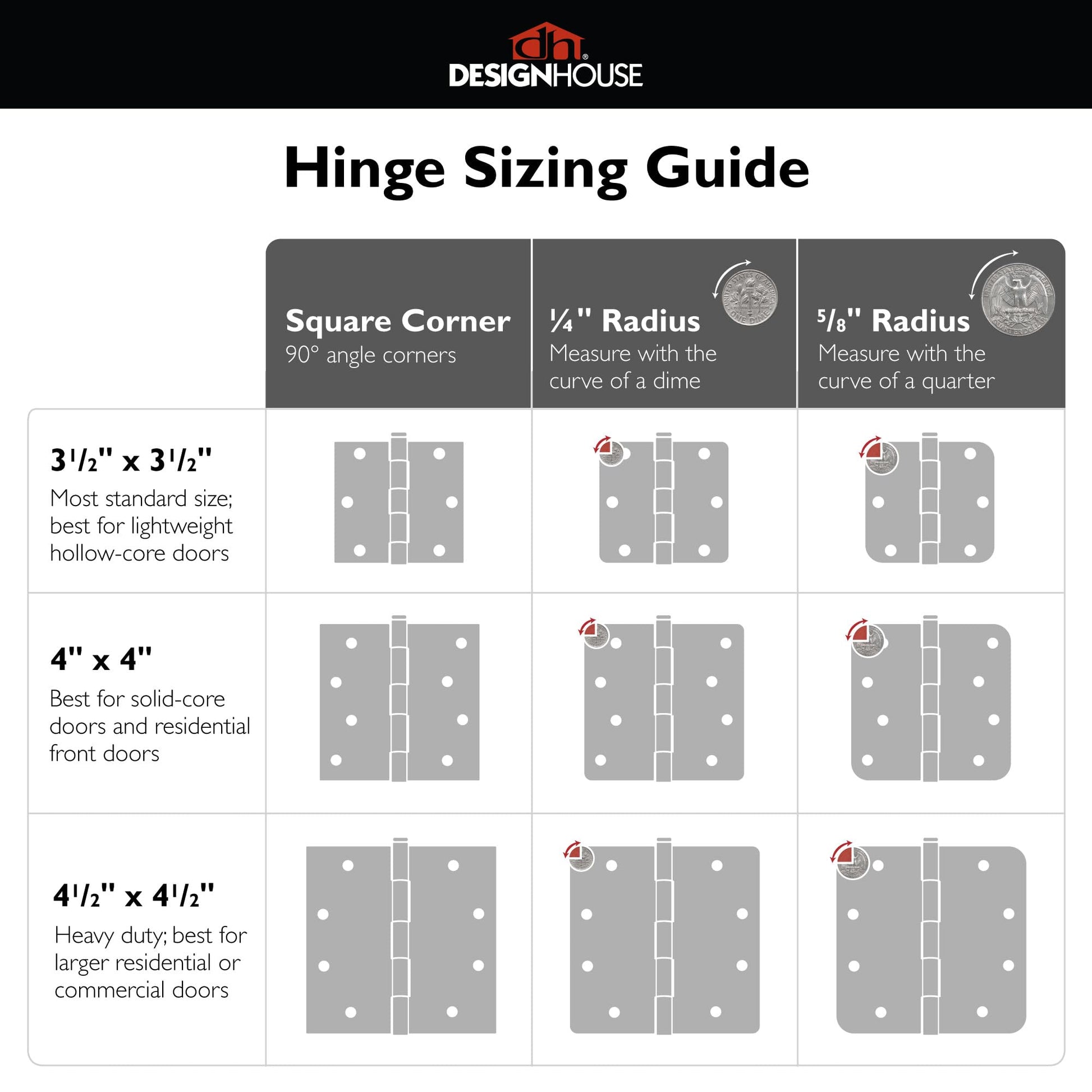 Details: The Design House 3-Pack Door Hinges are a durable, stylish, and practical solution for standard interior wooden doors. Measuring 3.5 inches by 3.5 inches with a 5/8-inch radius corner, these heavy-duty steel hinges support up to 50 pounds each, ensuring reliability for frequently used doors in high-traffic areas like bedrooms and bathrooms. The satin brass finish adds a warm, polished touch that seamlessly complements both traditional and modern decor styles. For most doors, three hinges are recommended, and this 3-pack is ideal for installing on a single door. Designed with plain bearings, these hinges offer dependable performance for everyday use, distinguishing them from ball bearing hinges, which are suited for heavier doors, and spring hinges, which automatically close doors. Pre-lubricated, water-resistant pins ensure smooth, quiet operation over time, reducing squeaks and wear. Installation is straightforward with #9 x 3/4-inch mounting screws included, while the removable pin makes door removal quick and hassle-free without the need to unscrew the hinge. Backed by a 1-year limited warranty, the Design House hinges deliver exceptional quality and peace of mind for your home improvement projects.