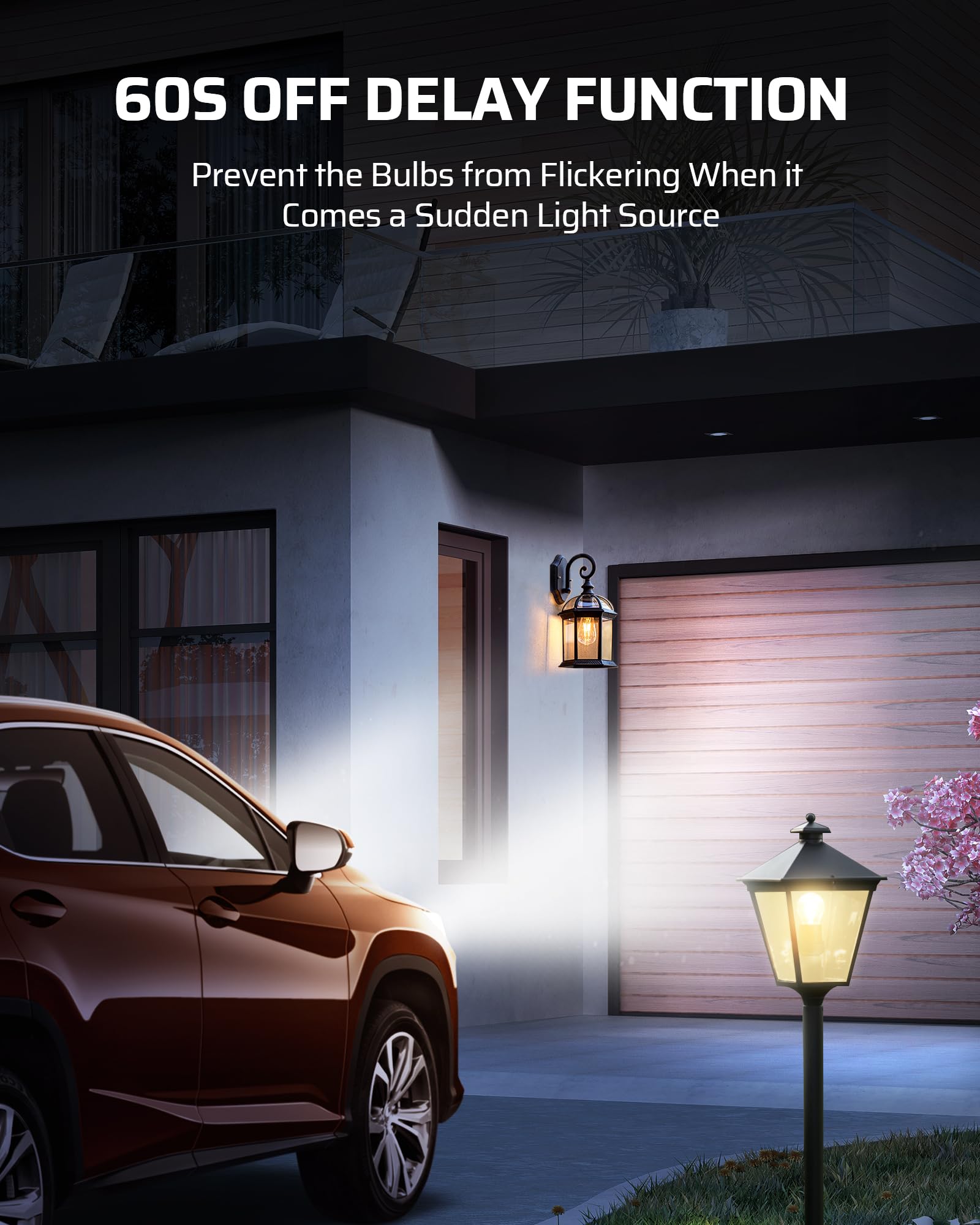 - [Off-Delay Function] Equipped with delay OFF function, prevent bulbs from repeatedly flickering due to sudden light sources; after 60s or longer light source motion - Auto Turn Bulbs Off