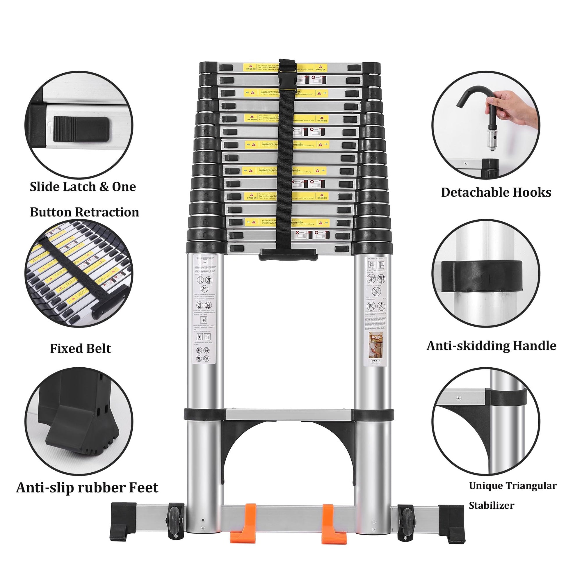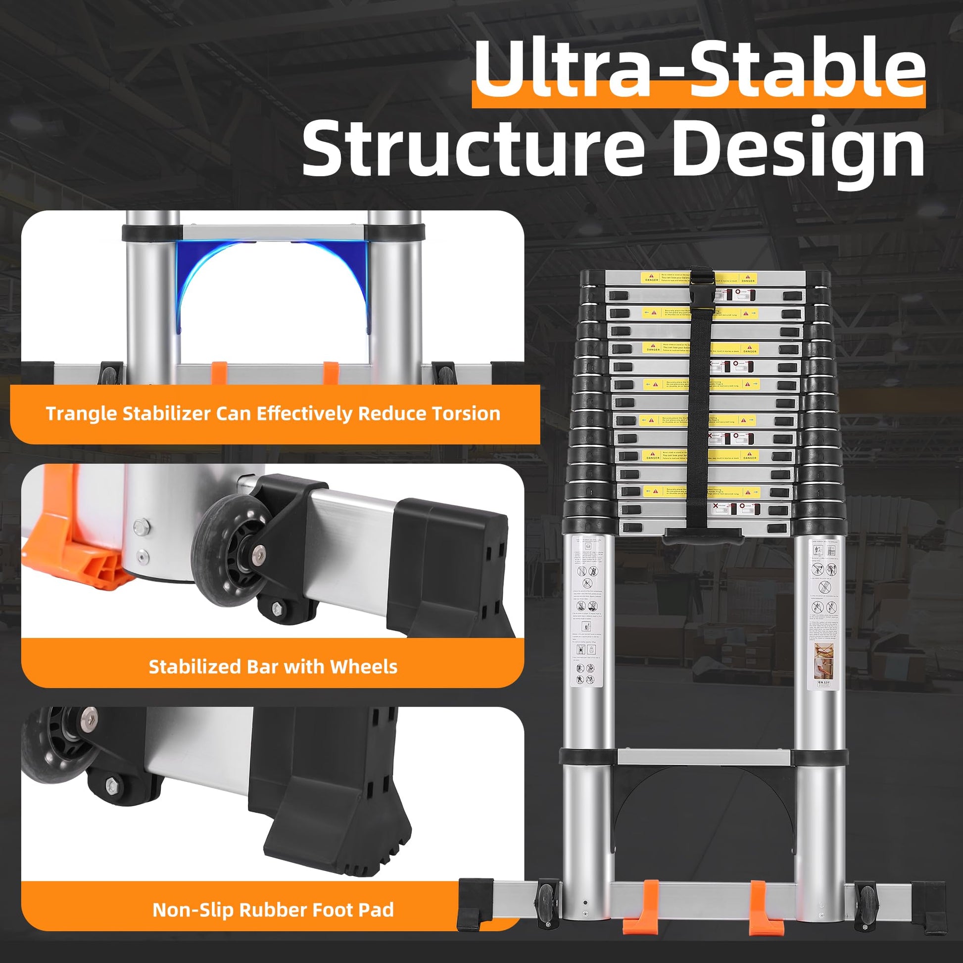 - 【Telescoping Ladder 2.0】Technological upgrades,added 2 new triangular stabilizers to the bottom of extendable ladder,enhance the ladder's stability by 35%,added detachable 2 hooks at the top of the ladder to adapt more usage scenarios.
