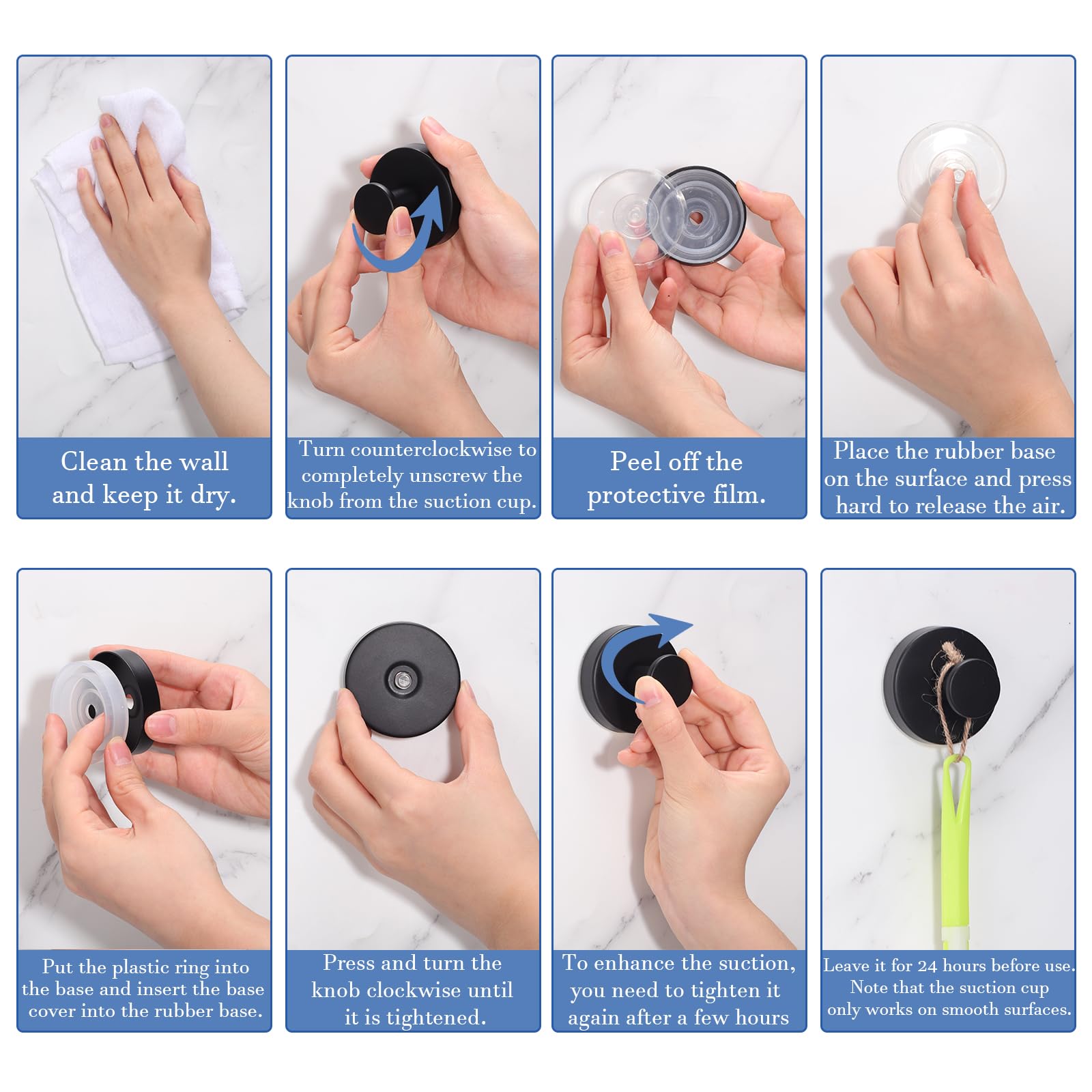 - 【Easy Installation】After cleaning and drying the area to be pasted, just tear off the suction cup protective film, press the suction cup hook against the wall, press hard to expel the air, and then tighten the knob clockwise. No drilling, no tools such as screws, no more unsightly holes on the wall.
