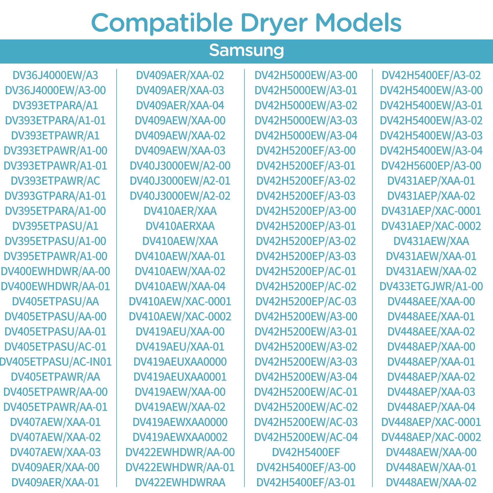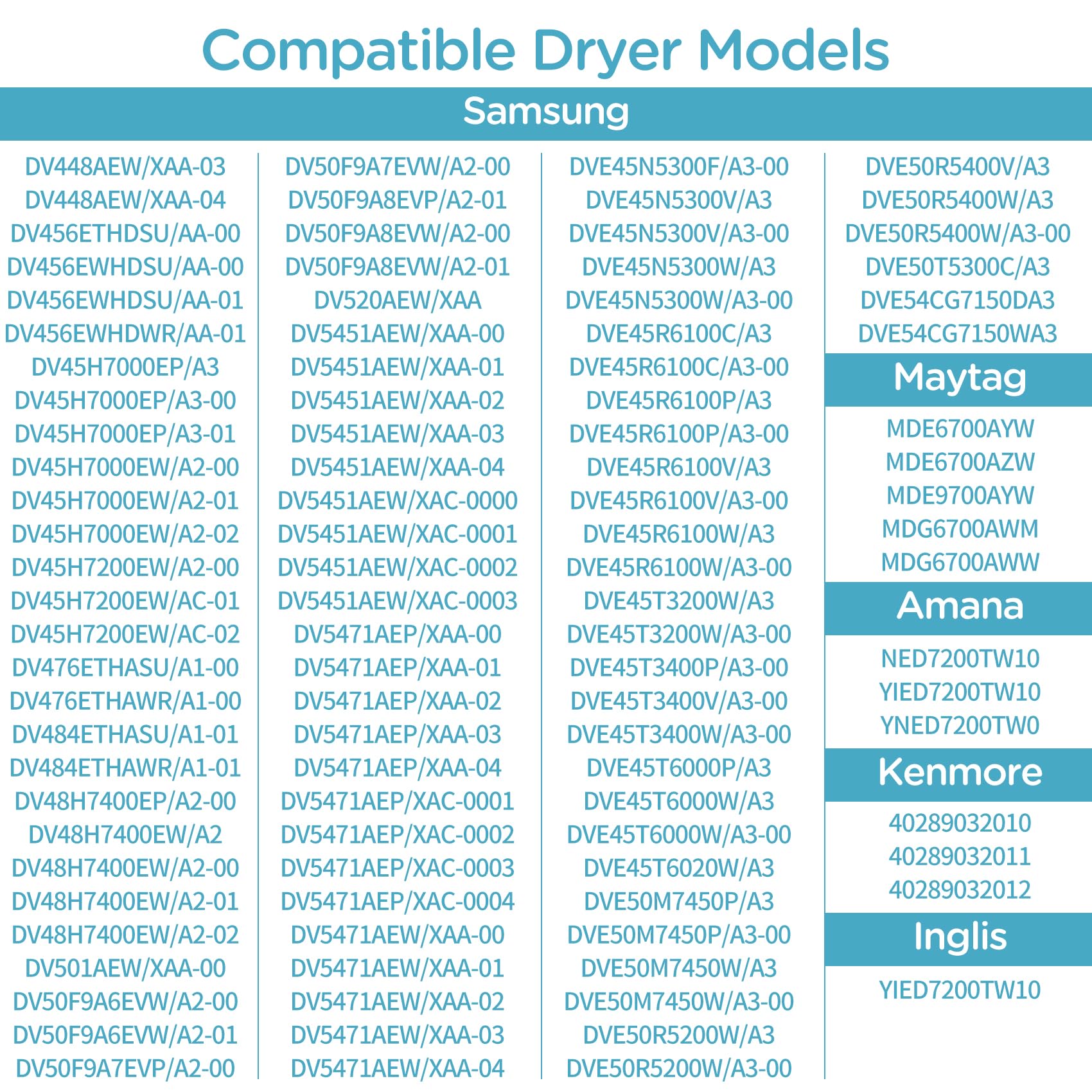 - 【Compatible Models】 sam sung DV50F9A7EVW/A2 DV50F9A8EVP/A2 DV50F9A8EVW/A2 DV520AEW/XAA DV5451AEW/XAA DV5451AEW/XAC DV5471AEP/XAA DV5471AEP/XAC DV5471AEW/XAA DVE45N5300F/A3 DVE45T3400P/A3 DVE45T3400V/A3 DVE45T3400W/A3 DVE45T6000P/A3 DVE45T6020W/A3 DVE54CG7150DA3 DVE54CG7150WA3.