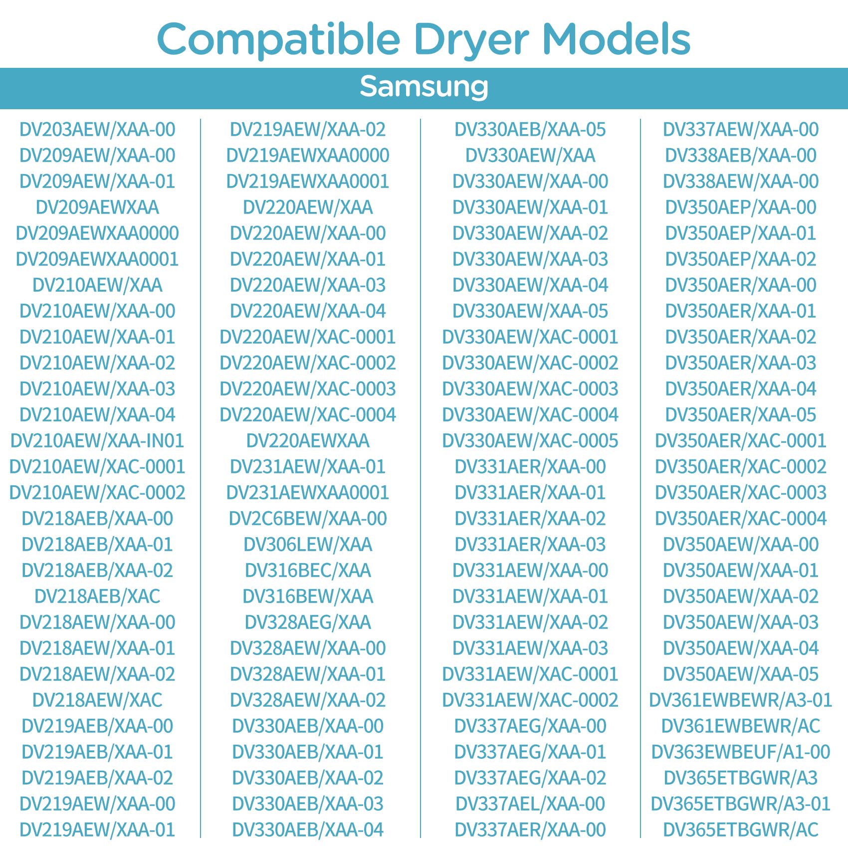 - 【Compatible Models】 sam sung DV210AEW/XAC DV218AEB/XAA DV218AEB/XAC DV218AEW/XAA DV218AEW/XAC DV219AEB/XAA DV219AEW/XAA DV219AEWXAA0000 DV219AEWXAA0001 DV220AEW/XAC DV231AEW/XAA DV231AEWXAA0001 DV2C6BEW/XAA DV316BEC/XAA DV316BEW/XAA DV328AEW/XAA DV330AEB/XAA DV330AEW/XAC DV331AEW/XAA DV331AEW/XAC DV337AEG/XAA DV337AEL/XAA DV337AER/XAA DV337AEW/XAA DV338AEB/XAA DV338AEW/XAA DV350AEP/XAA DV350AER/XAA DV350AER/XAC DV350AEW/XAA DV361EWBEWR/A3 DV361EWBEWR/AC DV363EWBEUF/A1 DV365ETBGWR/AC DV393GTPARA/A1 DV395ETPARA/A1 DV395ETPAWR/A1 DV400EWHDWR/AA DV405ETPASU/AC DV407AEW/XAA DV409AER/XAA DV409AEW/XAA DV40J3000EW/A2 DV410AERXAA DV410AEW/XAC.