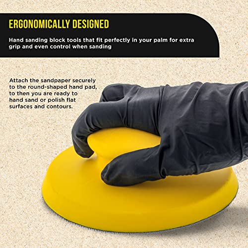 - An ergonomically designed, round hand sanding block tool that fits perfectly in your palm for extra grip and even control when sanding. Attach the sandpaper securely to the round hand pad, to then you are ready to hand sand or polish flat surfaces and contours.