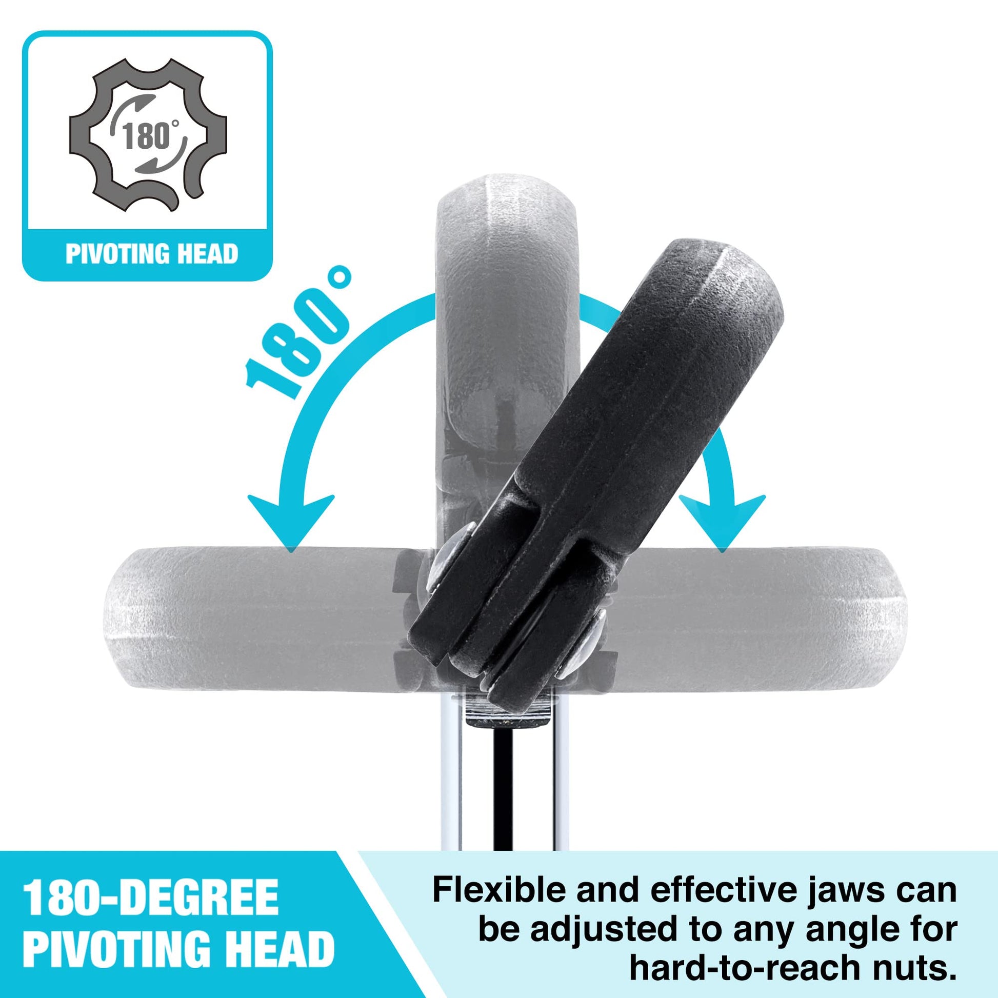 - 180 DEGREE ROTATING HEAD: The 180 pivoting head holds its position at any angle to access the nuts in hard-to-reach and narrow areas. It features a spring-loaded jaw that securely grips and easily tighten or remove the nuts of the faucet and sink