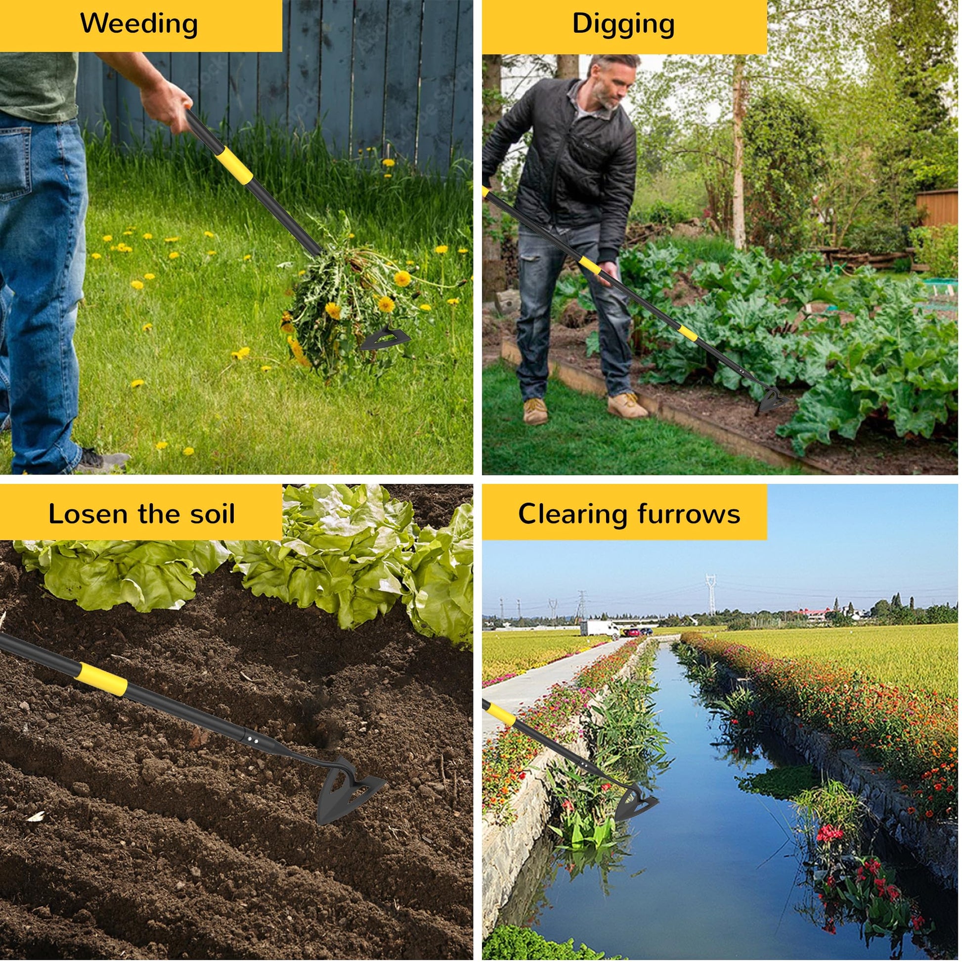 - ⛏ADJUSTABLE LENGTH HANDLE: The handle of this garden hoe consists of multiple rods connected by a threaded interface, which allows you to increase or decrease the number of rods to achieve a length that suits your height and reduces the pain caused by bending your back. Advanced welding technology is used between the pole and the hoe, which is strong and durable, and the hoe is not easy to separate from the pole.