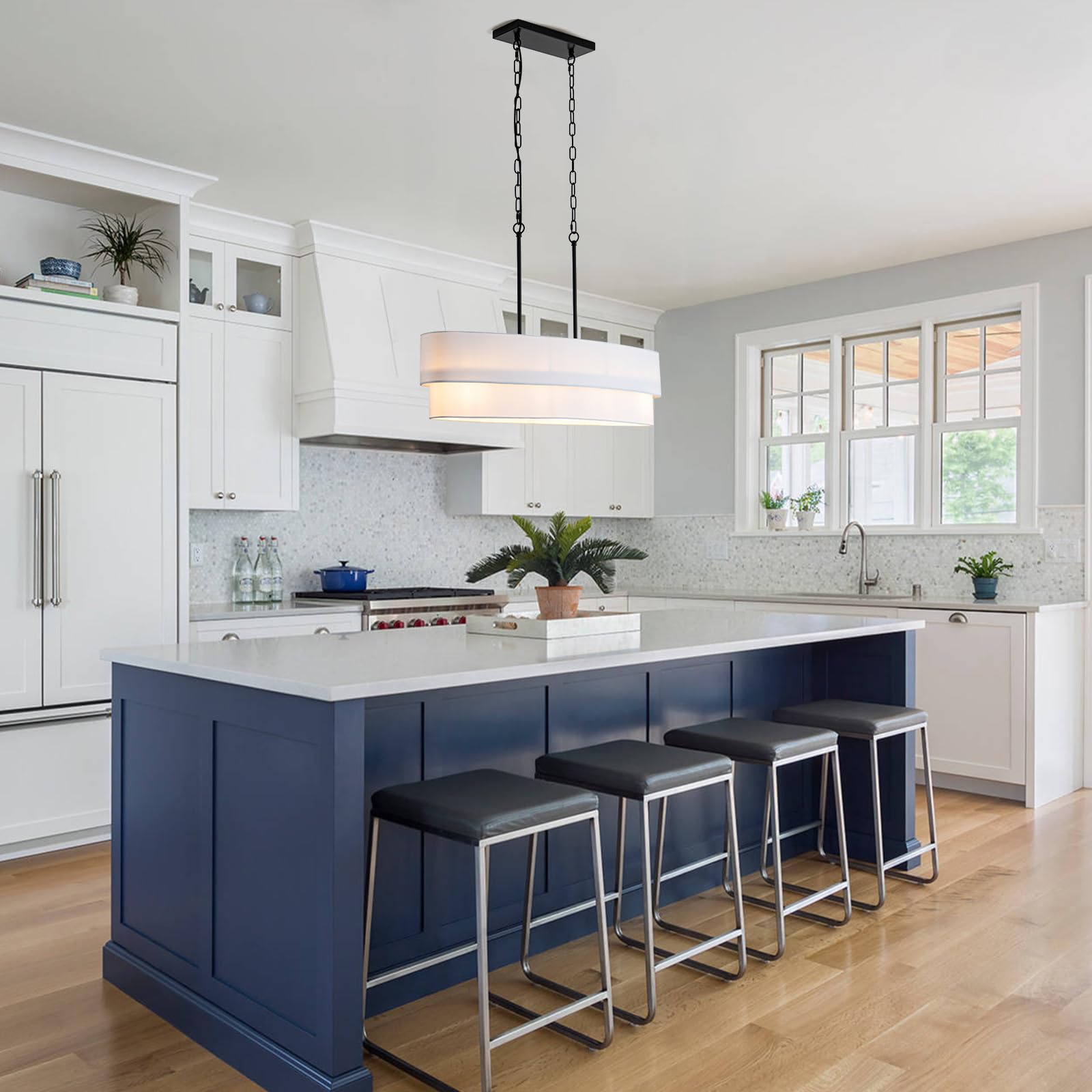 - Modern kitchen island lights Design - 4 light linear chandelier linen maded of the metal frames and 2-tier white linen fabric shade,which brings a fashion and rustic feel to the whole lamp body.It will perfect fit of go over a kitchen table or kitchen island light.