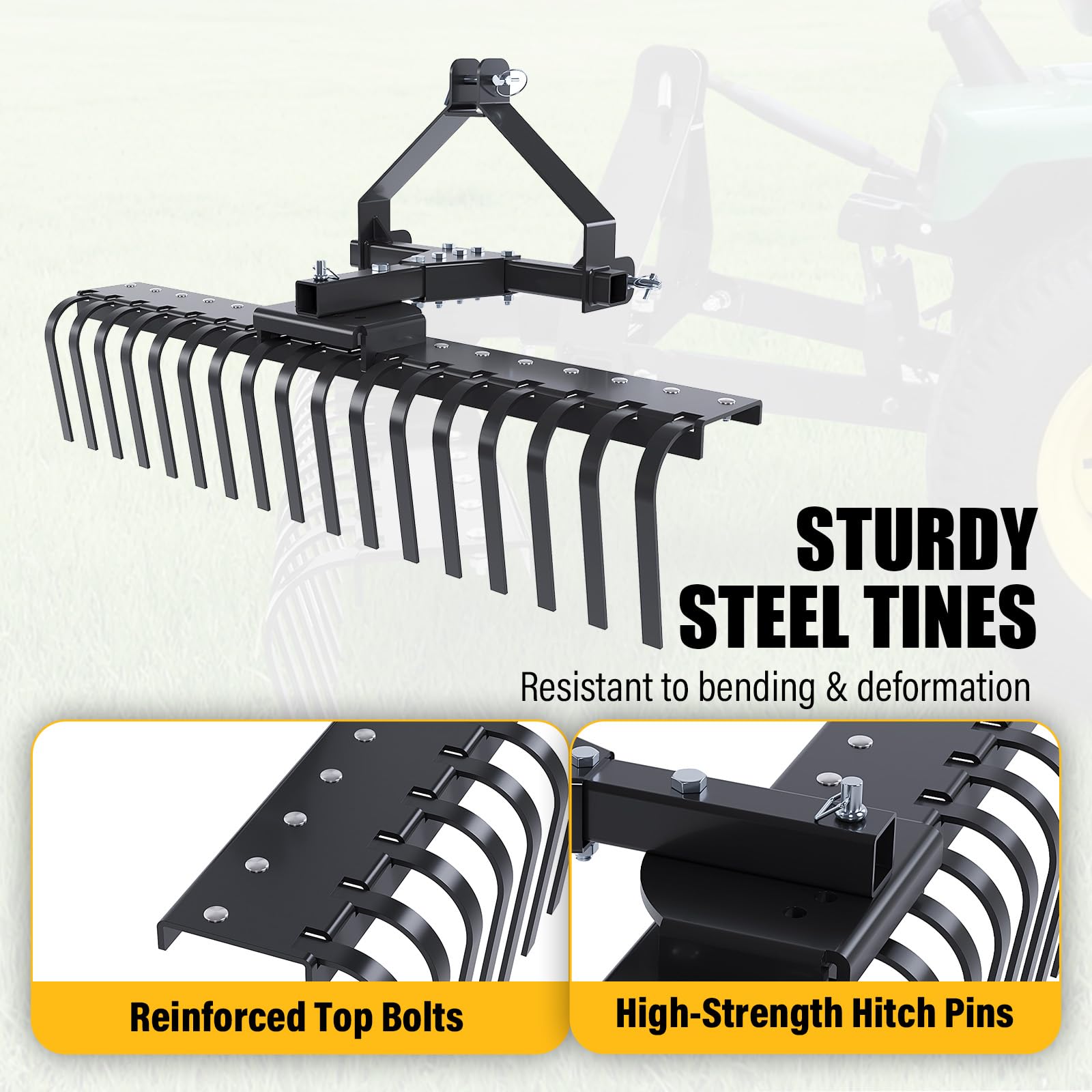 - Applicable - Our landscape rake features an integrated 3-point CAT-0 quick-mount system that allows for simple one-person attachment and detachment from your tractor, complete with all necessary mounting hardware including bolts and hitch pins for a secure connection, along with clear step-by-step assembly instructions