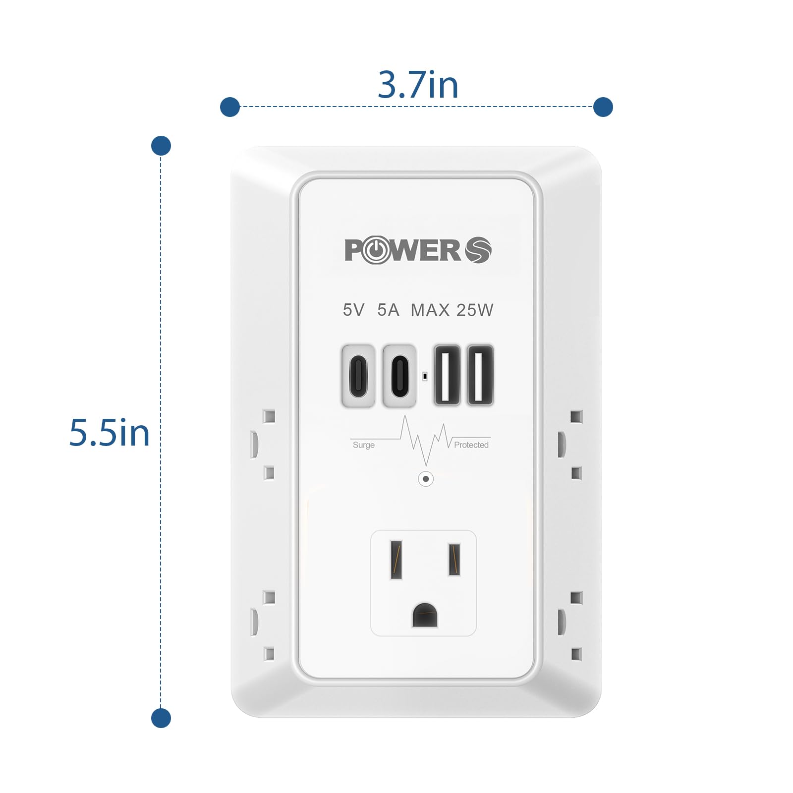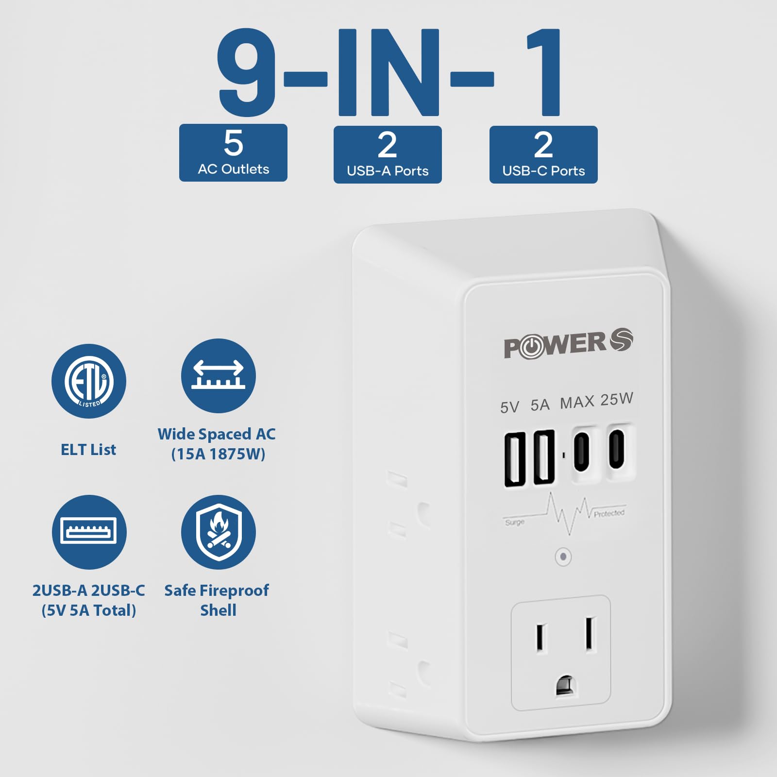- Maximize Your Wall Socket : Expand a single outlet into 5 AC plugs and 4 USB ports (2 USB-C + 2 USB-A) for all your devices. *Note: USB-C does not support high-voltage devices (14V–22V).* Ideal for travel, offices, and home use
