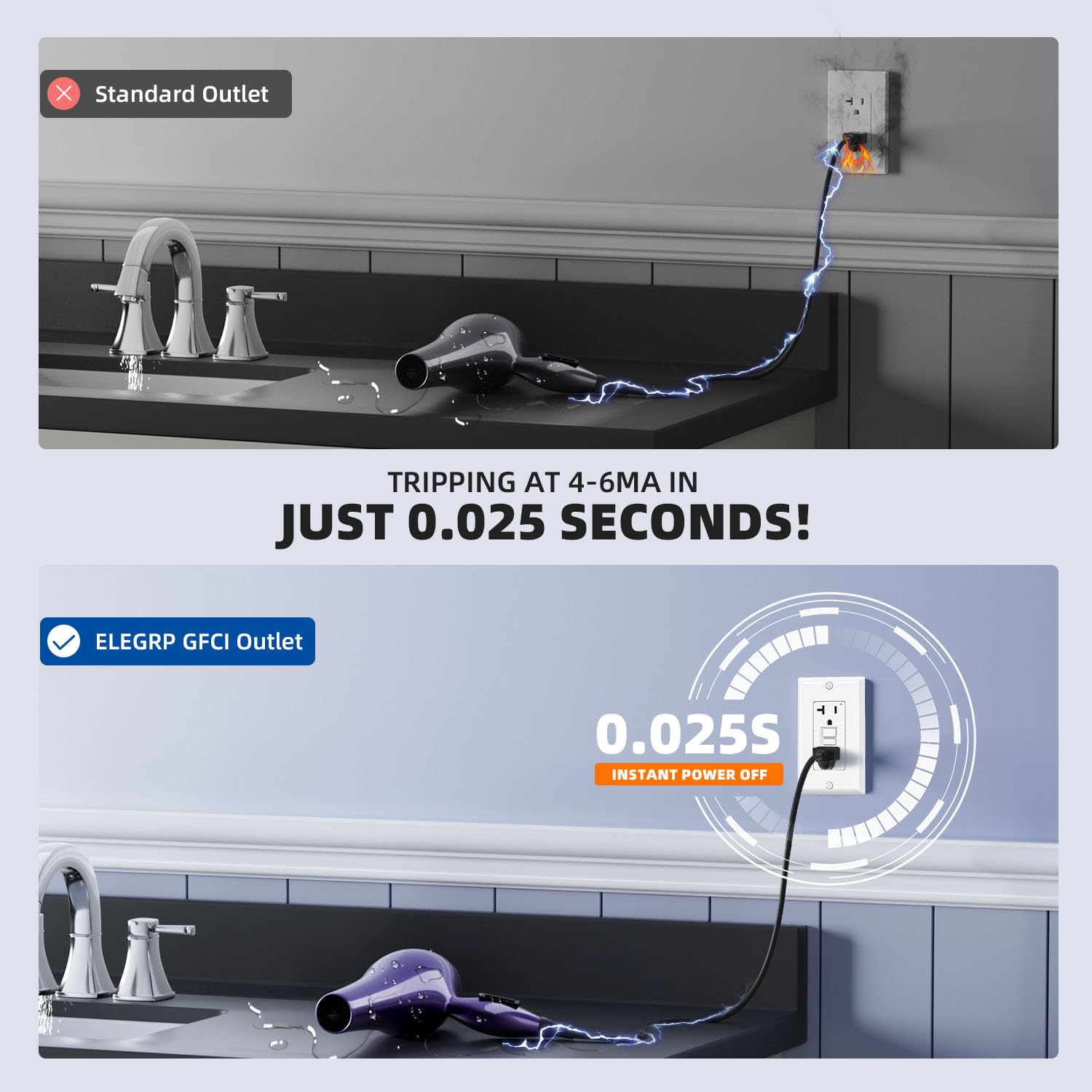 - ✅【Patented Self-Test Every 5 Seconds】 This GFCI outlet automatically performs a self-test every 5 seconds—far more frequently than the UL standard of every 3 hours—to ensure it's always ready to protect against electrical shock. In the event of a ground fault, it cuts power in just 0.025 seconds, providing fast and reliable safety for your home.