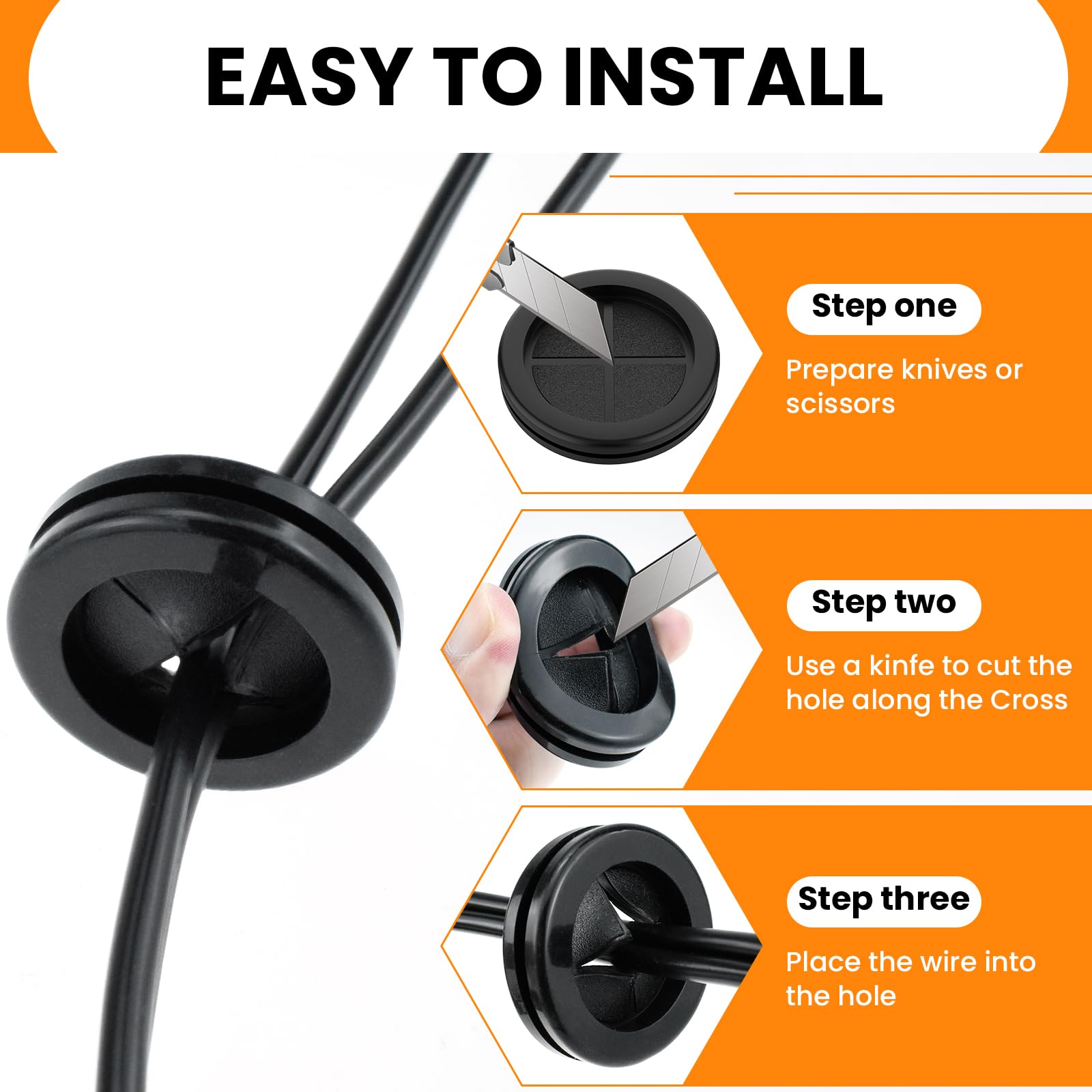 - Easy to install, according to the thickness of the cable, the pass diameter of the rubber grommets can be cut freely, and the rubber sleeve can be easily snapped directly into the drilled hole.