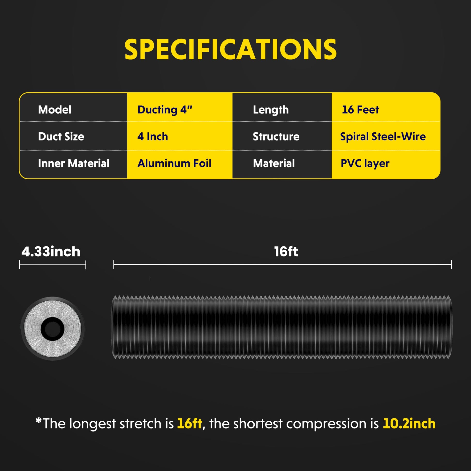 Flexible 4-Inch Aluminum Ducting, Dryer Vent Hose, Heavy-Duty Three-Layer Protection, 16-Feet Long for Heating Cooling Ventilation and Exhaust, Black