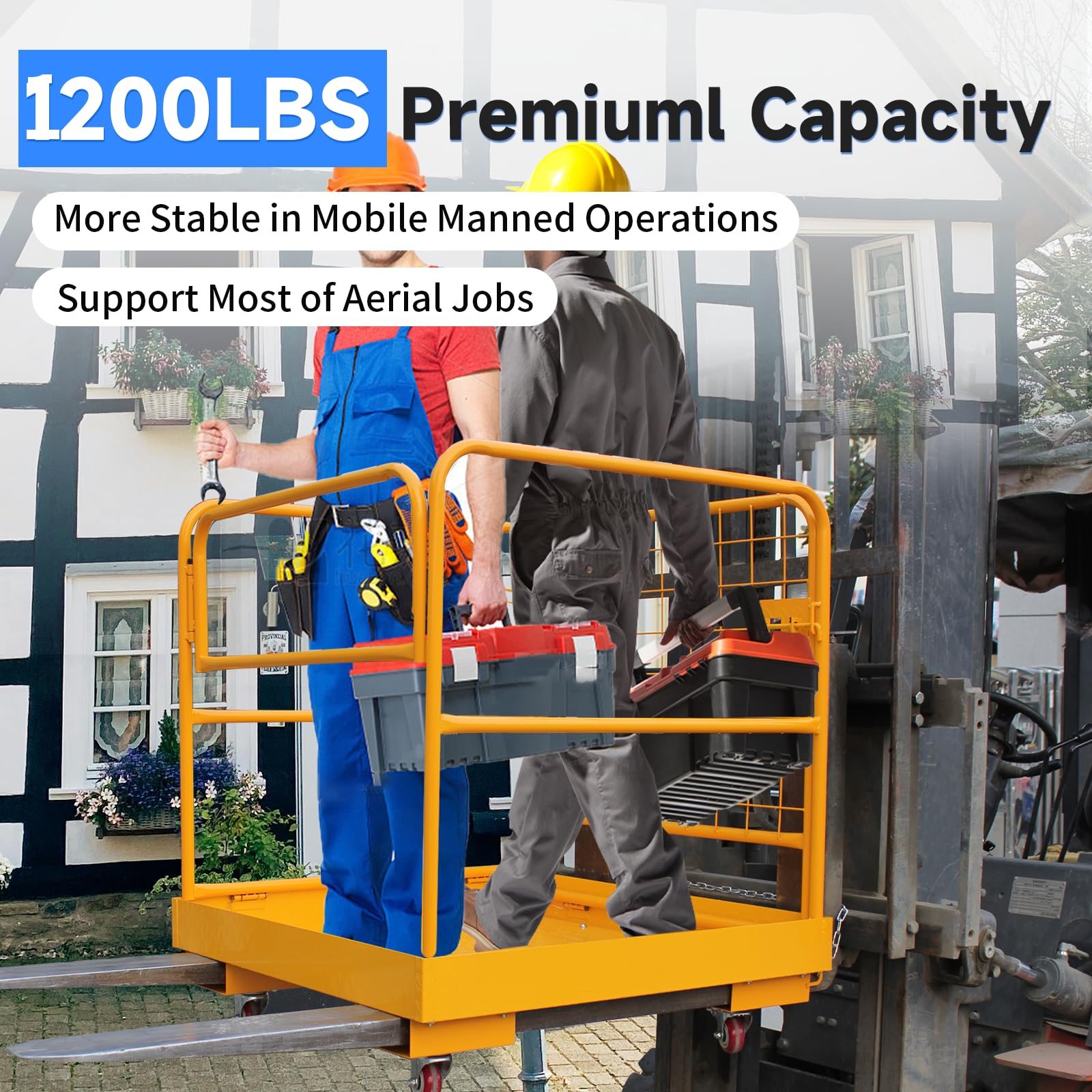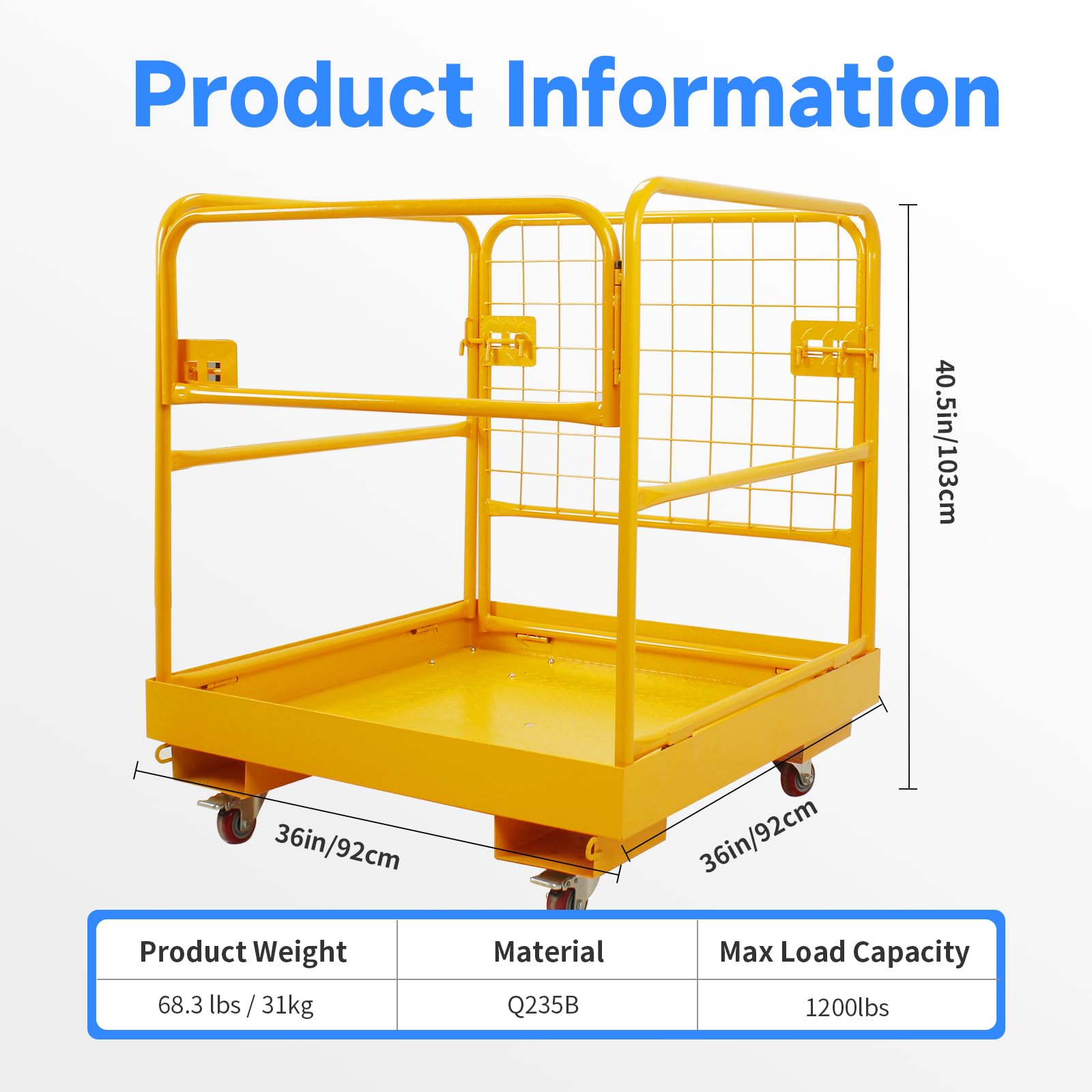 - 【Heavy-Duty Forklift Man Basket】Measuring 36"L×36"W", our forklift safety cage supports up to 1200 lbs - ideal for workers with tools. The spacious design allows safe movement while working at height, compatible with all standard forklifts and pallet jacks.