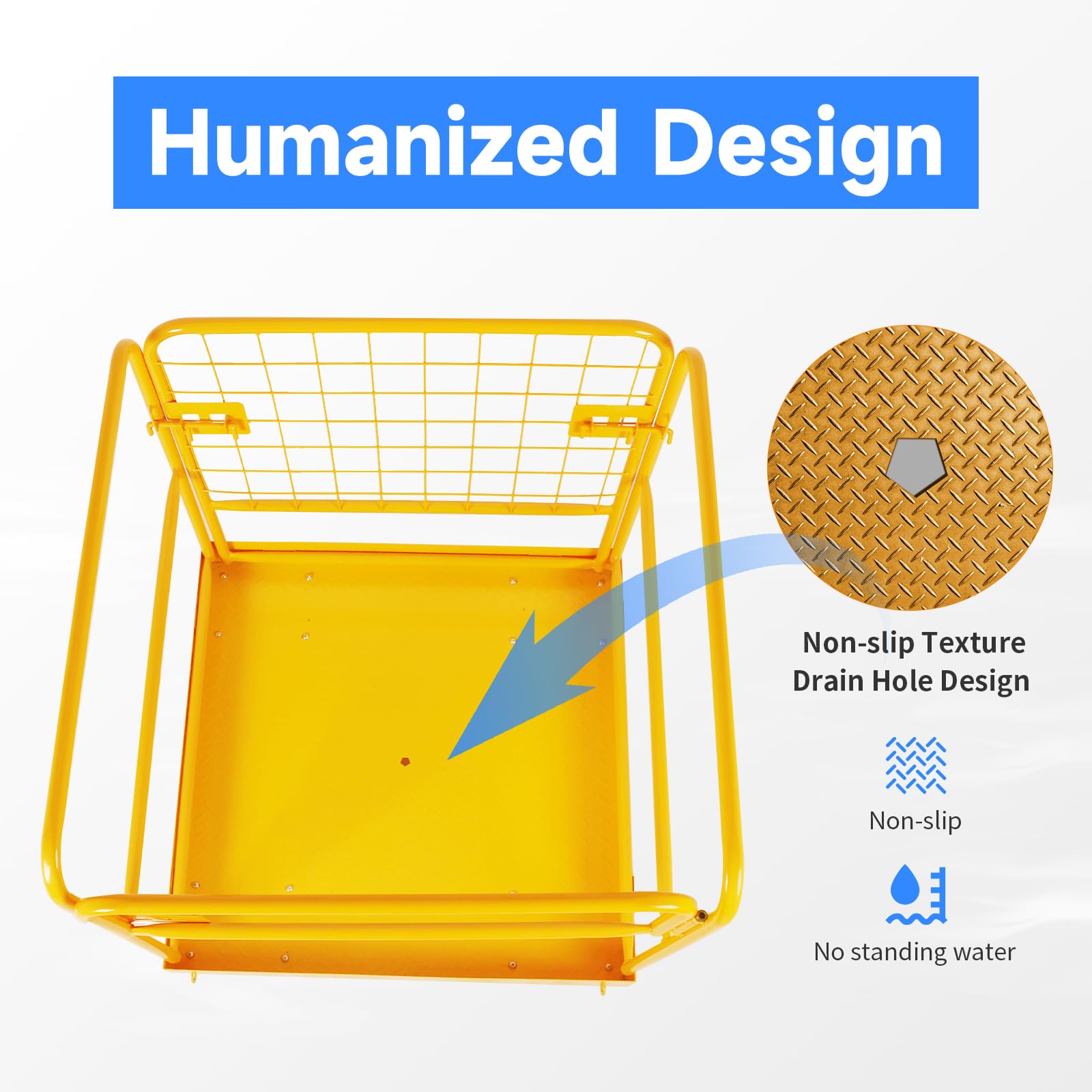 - 【Safe Design】Reinforced steel mesh walls and locking gates ensure stability, while anti-slip flooring prevents falls. Integrated drainage ports allow easy cleaning, providing secure elevated worksite protection.