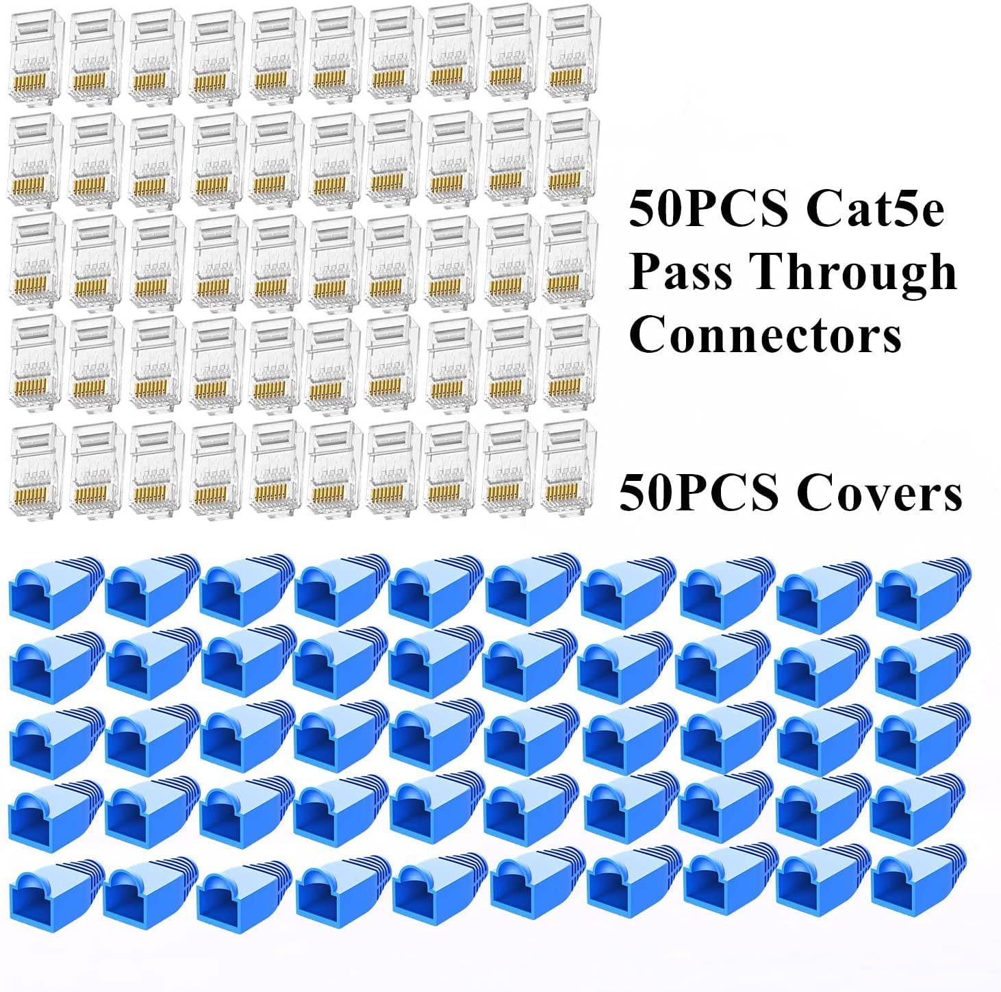 - 50 PCS rj45 Cat5e Pass-Through Connectors and 50 PCS Covers: This ri45 crimp tool kit is carried with 50 PCS nice quality rj45 cat5e pass-through connectors; 50 PCS covers to protect these connectors from being affected by dust and water, and cause poor contact