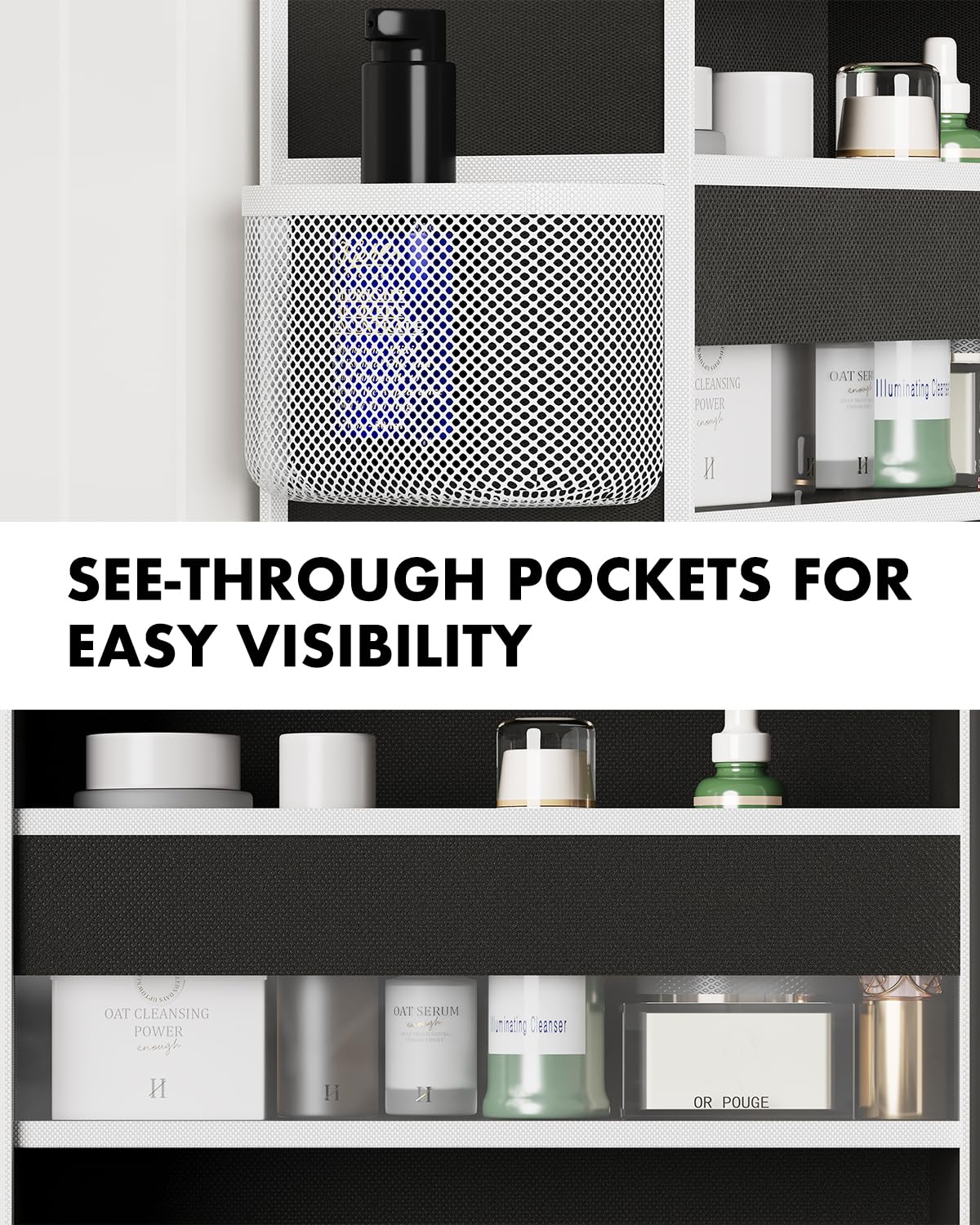 - Extra Large Capacity: Our Behind the Door Organizer measures 55”x 15”x 7”, providing plenty of space for organization and storage. This sturdy over the door organizer can hold up to 50 lbs and has 6 spacious front pockets designed 4 different sizes of flexible storage for different storage needs. The 12 mesh side pockets are perfect for lipstick, keys, chargers, remotes, glasses and other small household essentials.